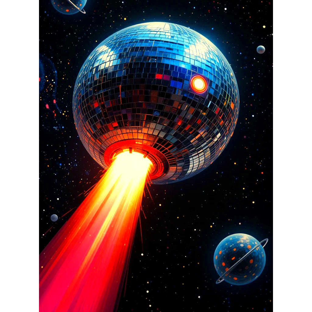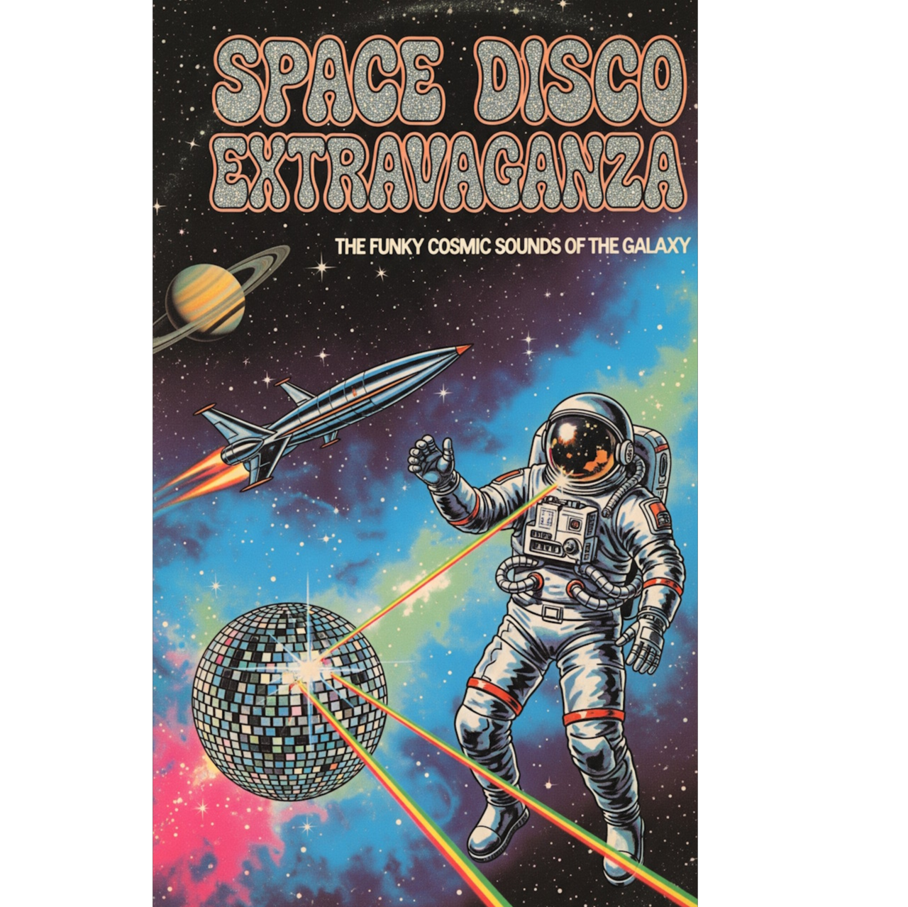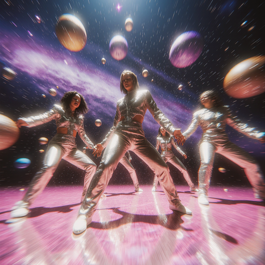 A space disco epic that journeys through the decades of cosmic dance music, Begins in the 1960s with retro-futuristic lounge grooves, theremins, sci-fi sound effects, and swinging space-age pop vocals, Transitions into the 1970s with classic disco strings, funky bass, glittering synths, and four-on-the-floor beats — pure interstellar disco fever, Evolves into the 1980s with neon synthwave vibes, robotic vocoders, laser-like arpeggios, and cosmic drum machines, Shifts into the 1990s with French house grooves, filtered disco loops, and hypnotic vocal mantras, Climaxes in a modern space disco anthem with powerful EDM-influenced drops, lush synth pads, galactic choirs, and euphoric festival energy