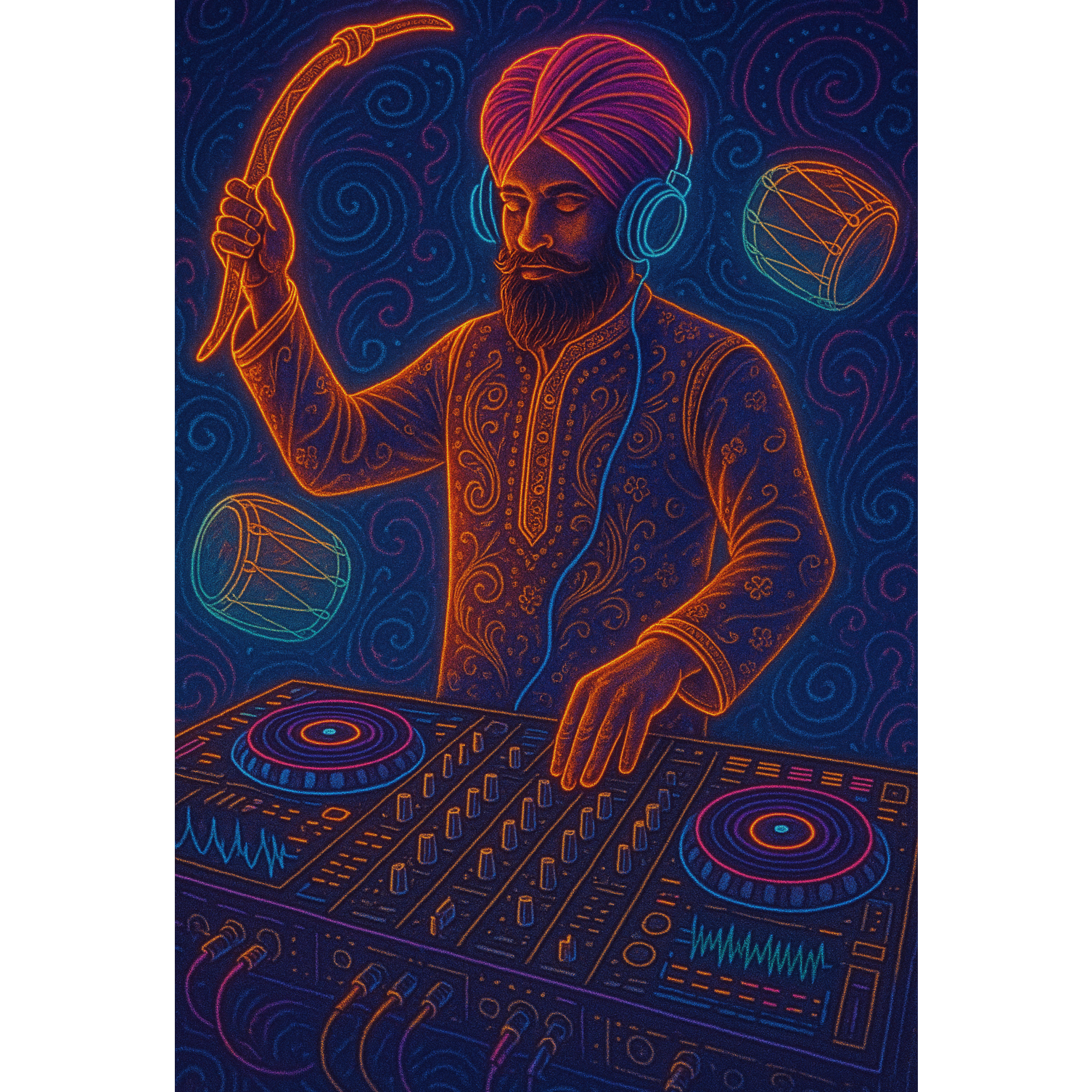 A lively bhangra track driven by powerful dhol rhythms, syncopated claps, and rapid-fire tumbi riffs, Verses use call-and-response vocals over bouncing bass and sizzling percussion, Choruses explode with brass stabs, punchy synths, and group shouts, while percussion breakdowns keep energy at a peak