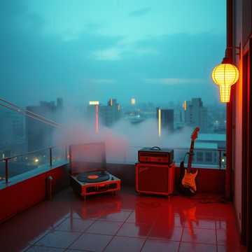 Nujabes-style lo-fi hip hop instrumental, dreamy guitar arpeggios and Rhodes melody and soft kick and airy synth pad, nostalgic tokyo summer rooftop mood, film grain sound with subtle stereo width, floating loop structure, 88 BPM