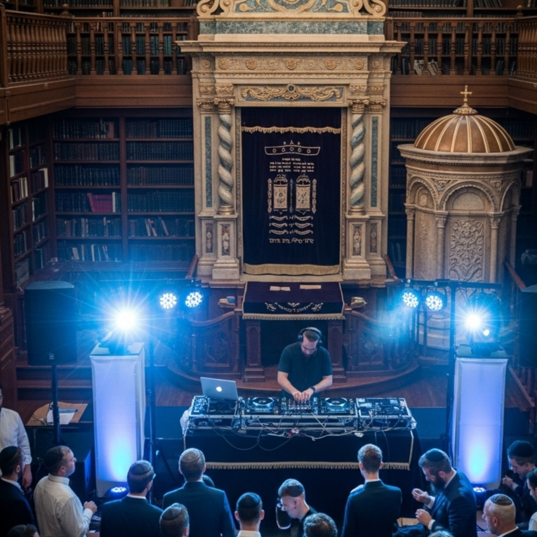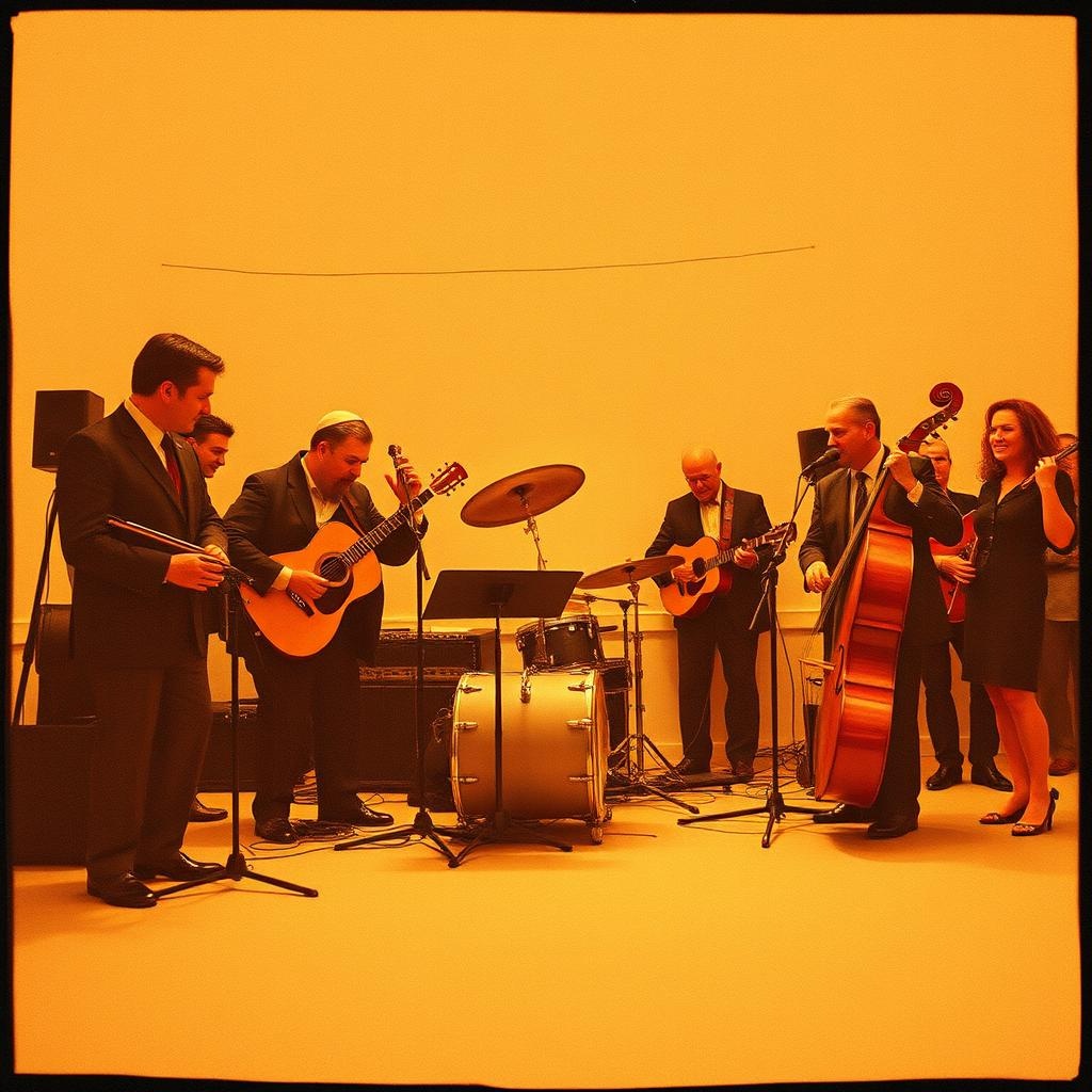 Hasidic Jewish song, Techno rhythm, trumpet accompaniment, electric guitars, 140 BPM