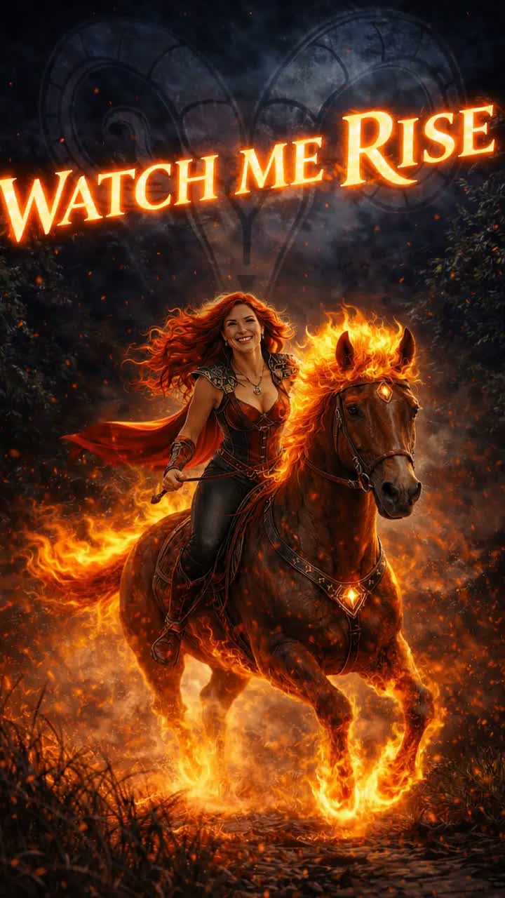 Verse 1: Intimate, reflective piano, vulnerable vocals, describe Aries traits, Mars energy, fire, passion, challenges, Gradually add soft guitar and bass, Pre-Chorus: Tension rises, drums enter, vocals gain strength, hint of anthem, Emotional lift, Chorus: Full band, electric guitar distortion, big drums, layered powerful vocals, Anthemic, singable, “Watch me rise” repeated, Emotional climax, triumphant, cathartic, Verse 2: Return to strong vocals, add guitar riffs, describe Aries independence, courage, Fire Horse energy, solo reflection, Bridge: Soft breakdown → build tension → explode into final chorus, Dramatic strings, wide vocals, Final Chorus & Outro: Maximum energy, all instruments, layered vocals, epic fade, empowering, Kriegstrommeln, Fackel, breathy female voice powerfull but not too high
