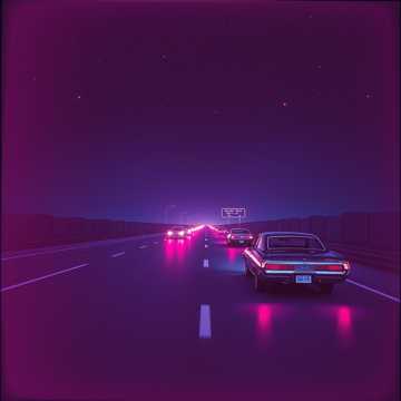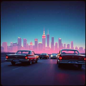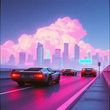 Retro synthwave, driving 80s beats, energetic and fast-paced, pulsating basslines, soaring synth melodies, neon-drenched atmosphere, evokes car chases, cinematic and nostalgic, high-octane vibes