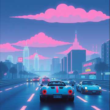 Italodisco, retro, driving 80s beats, energetic and fast-paced, pulsating basslines, soaring synth melodies, neon-drenched atmosphere, evokes car chases, cinematic and nostalgic, high-octane vibes