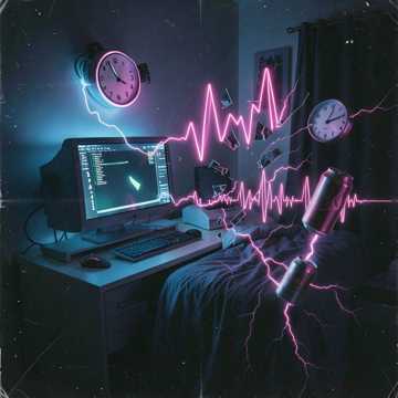 Chaotic breakcore assault: 190+ BPM chopped jungle breaks, bit-crushed kicks, distorted Reese bass, jittery glitch hits, and blown-out male vocals, Verses feel like a panic spiral in a crowded room; chorus locks into a brutal, shout-along hook with stacked, shouted gang vocals and harsh stereo delays, Brief filtered drop in the bridge, then everything slams back in with extra-saturated drums and screaming top-line, breakcore