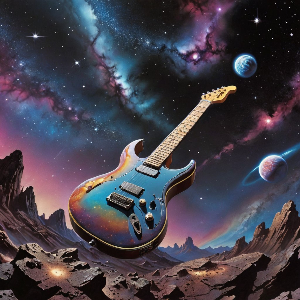 Experimental cinematic fusion of electric guitar riffs and dark electronic sound design, Distorted lead guitar delivers a tense repeating theme, fragmented and layered with deep sub-bass, granular textures, and glitchy percussion, The rhythm feels unstable yet hypnotic, with atmospheric pulses and evolving electronic layers, Analog synths morph into futuristic soundscapes, blending noise, drones and cosmic sweeps, The overall tone is immersive, abstract and unsettling, closer to an audio hallucination than a conventional theme, evoking a sci-fi thriller in a fractured, modern language