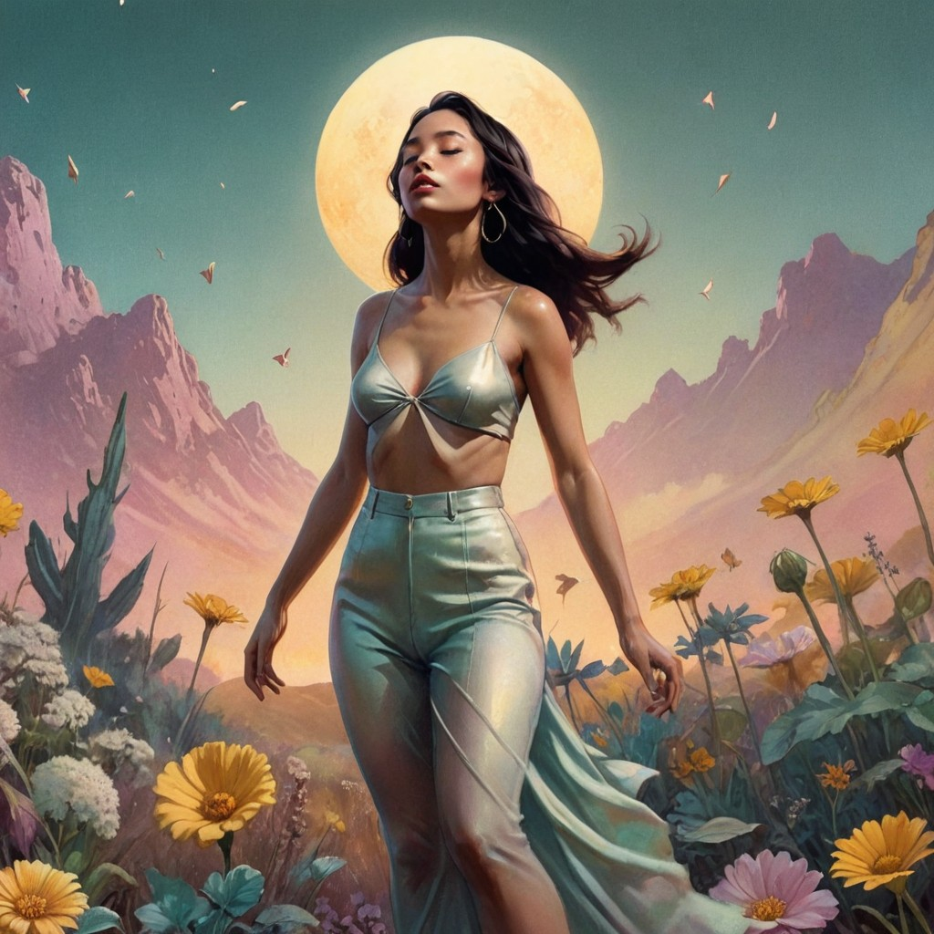 This trip hop and chamber pop track opens with swirling ambient synths and hypnotic female vocals weaving between mantra-like and melodic motifs, Layered choirs loop trance-like harmonies, while sparse whispers add depth, Instrumental breaks dissolve into avant-garde, psychedelic swells, sustaining a glamorous, dreamlike repetition with lush textures and gradual, immersive builds