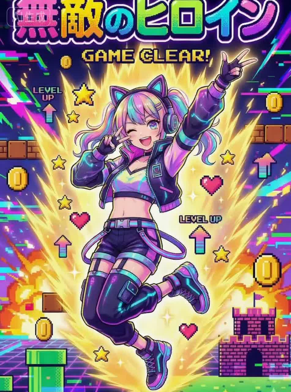 J-Pop, Hyperpop, Chiptune, Happy Hardcore, Female Vocals (Anime Voice, Hyper-Energetic, "Gamer Girl" vibe, Playful Verse, building to Victorious/Sparkling Belting High Pitch), Retro Synth, Fast Drums, Coin FX, Power Up FX, Electric Guitar, Game, Invincible, Victory, High Tension, "Chorus Intro" Structure, Catchy Melody, Soaring High Notes, Combo Rhythm, BPM 170