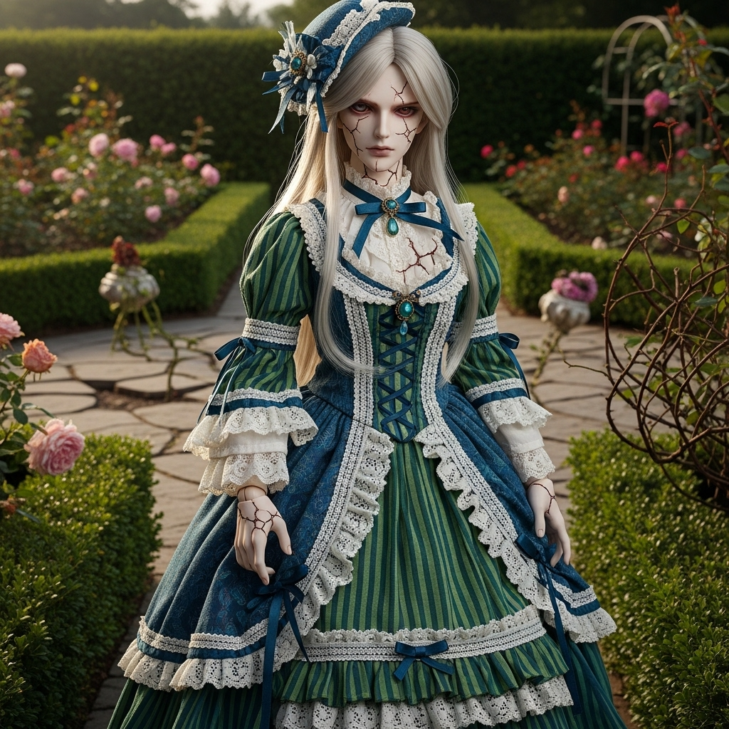 Victorian parlor music, overwhelmingly using a variation of the D minor diminished triad (D-F-A♭) in the song, gothic lolita aesthetic, dark classical, chamber music, a hauntingly beautiful and fragile music box melody is the lead instrument, accompanied by sparse harpsichord and melancholic cello, a delicate, breathless, and broken-sounding androgynous male vocal, like a cracked porcelain doll singing