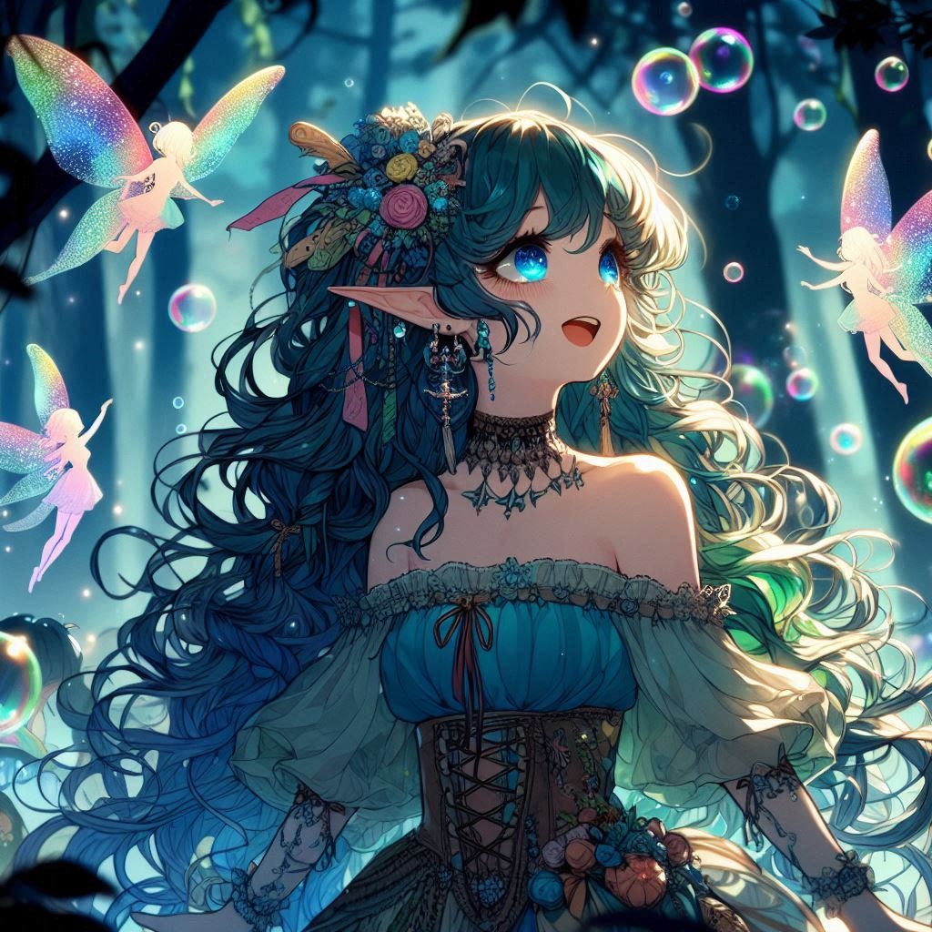 Medieval bardic symphonic whimsical fairy metal, playful, female voice, violin pizzicato, hurdy-gurdy, lively, magical, cheerful, catchy, cute, bubbles, water synths, storytelling, medium pace