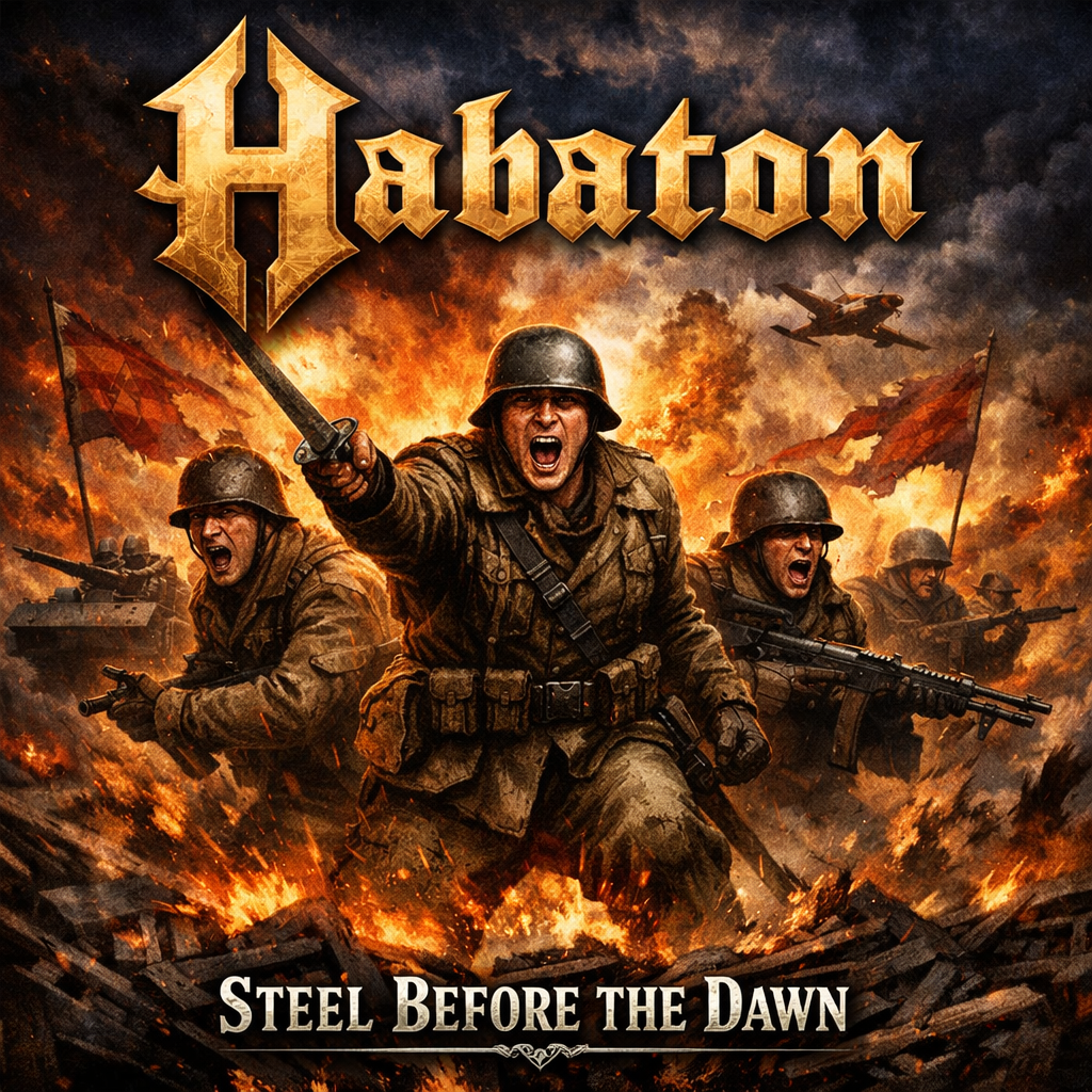 Heavy metal with a mid-tempo march rhythm, pounding drums, and sharp, palm-muted guitar riffs, Thick, layered synth walls dominate the background like artillery fire, creating an epic and cinematic atmosphere, Vocals are deep, steady, and commanding — not overly melodic, but rhythmically tight and bold, Occasional chanted backing vocals add battlefield intensity, Include a dramatic spoken bridge and a triumphant, slow-burning final chorus, Style matches iconic war-themed metal