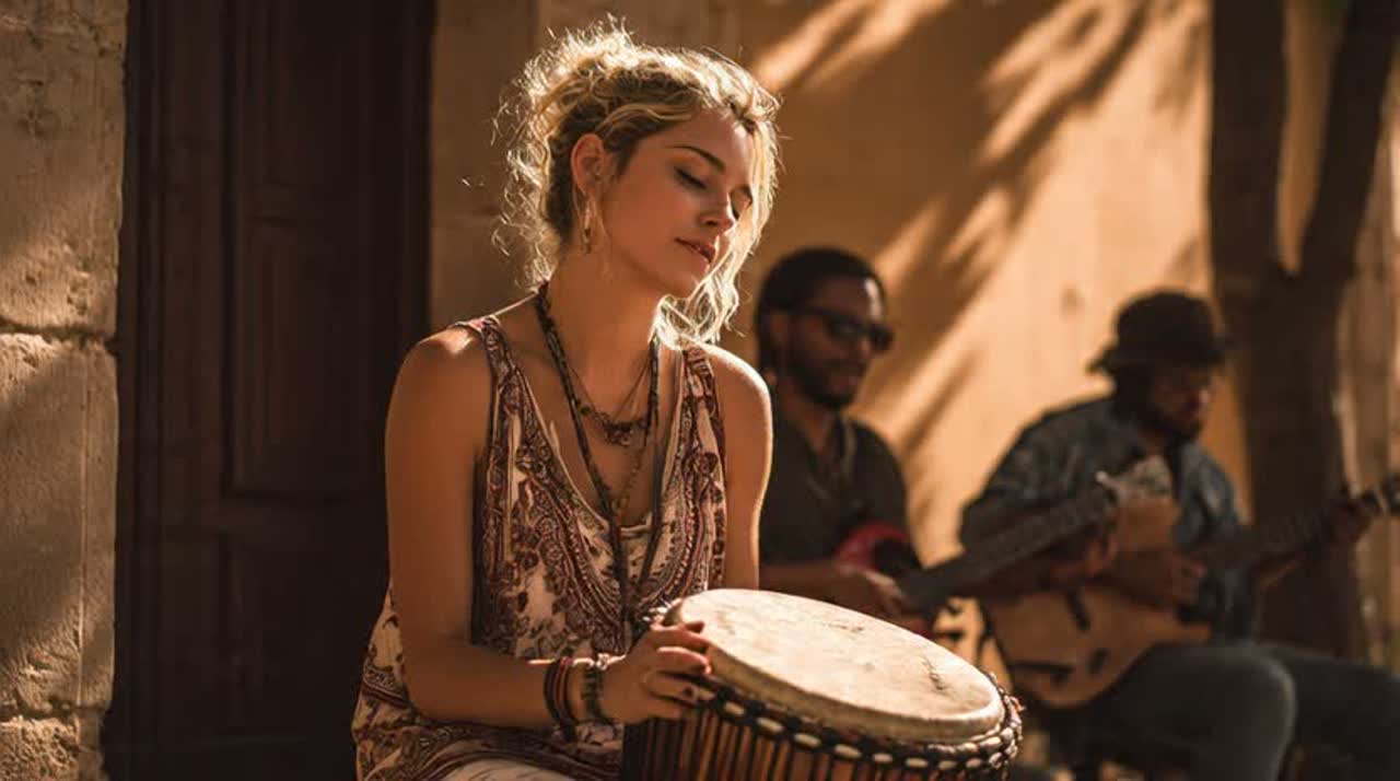 · Acoustic Foundation: Binaural recordings of folk instruments: gentle Gusli psaltery arpeggios, breathy Kalyuka overtone flute melodies, deep, buzzing Jaw Harp vargan, Layers of organic acoustic percussion finger drums, wooden clicks, subtle shakers, · Digital Layer: Broken, skittering rhythms in the style of freestyle vibe, Deep, sub-bass frequencies, Intentional digital artifacts, bit-crushed textures, tape hiss woven