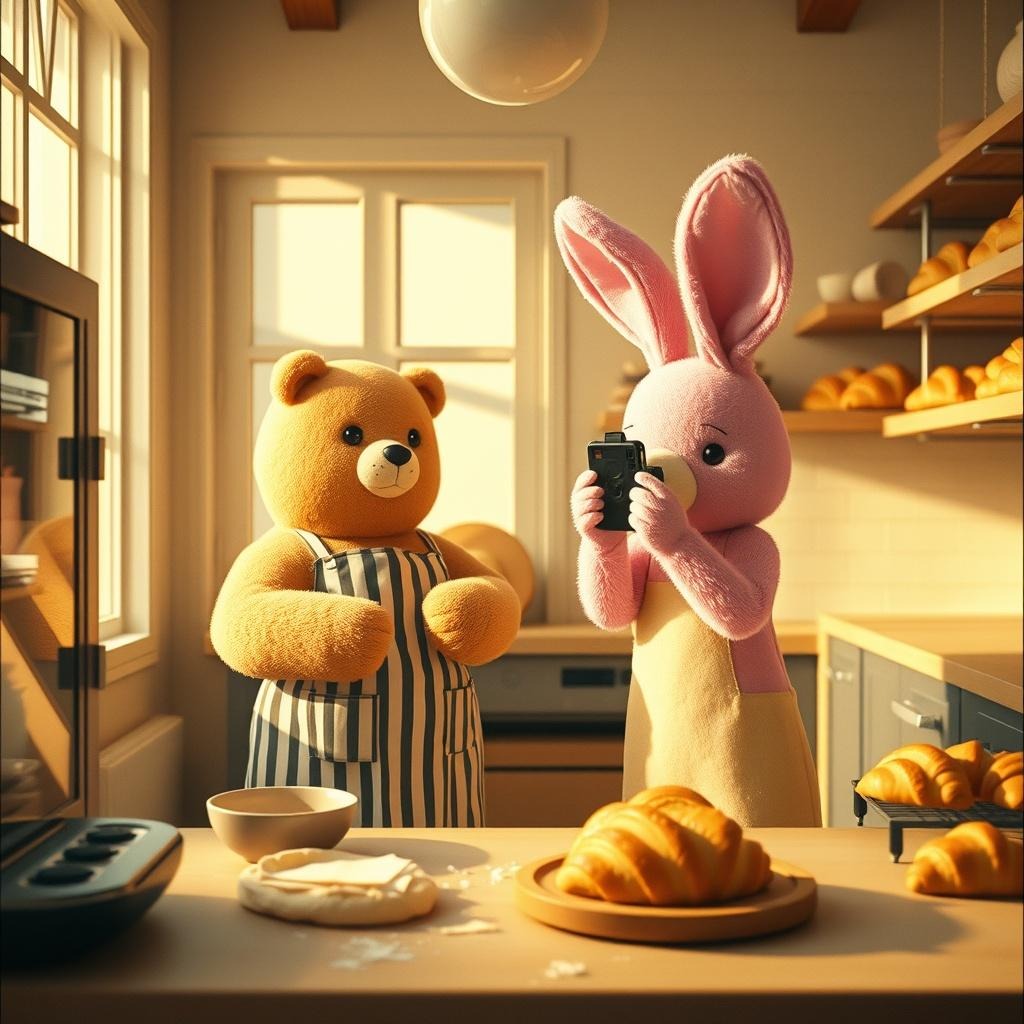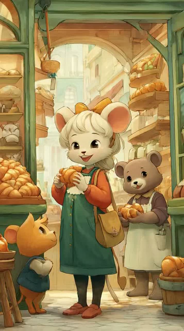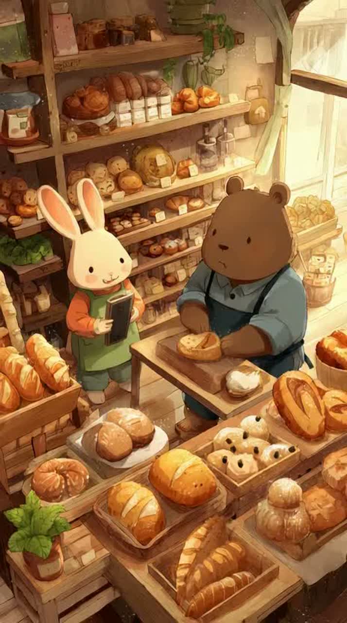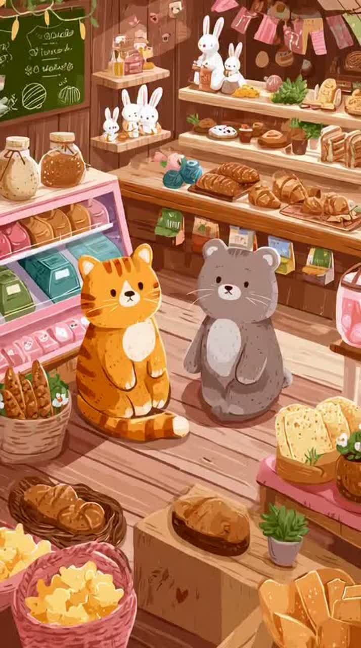 Description: A modern retelling of a bakery story, A cute young girl whispers a bedtime story about a Rabbit and a Bear opening a trendy bakery, Focus on soft speech and "ear-cleaning" style vocal clarity