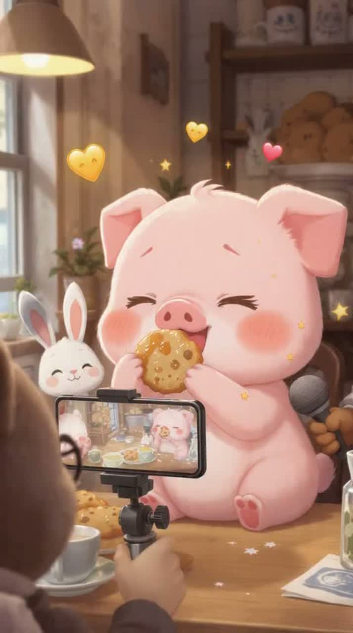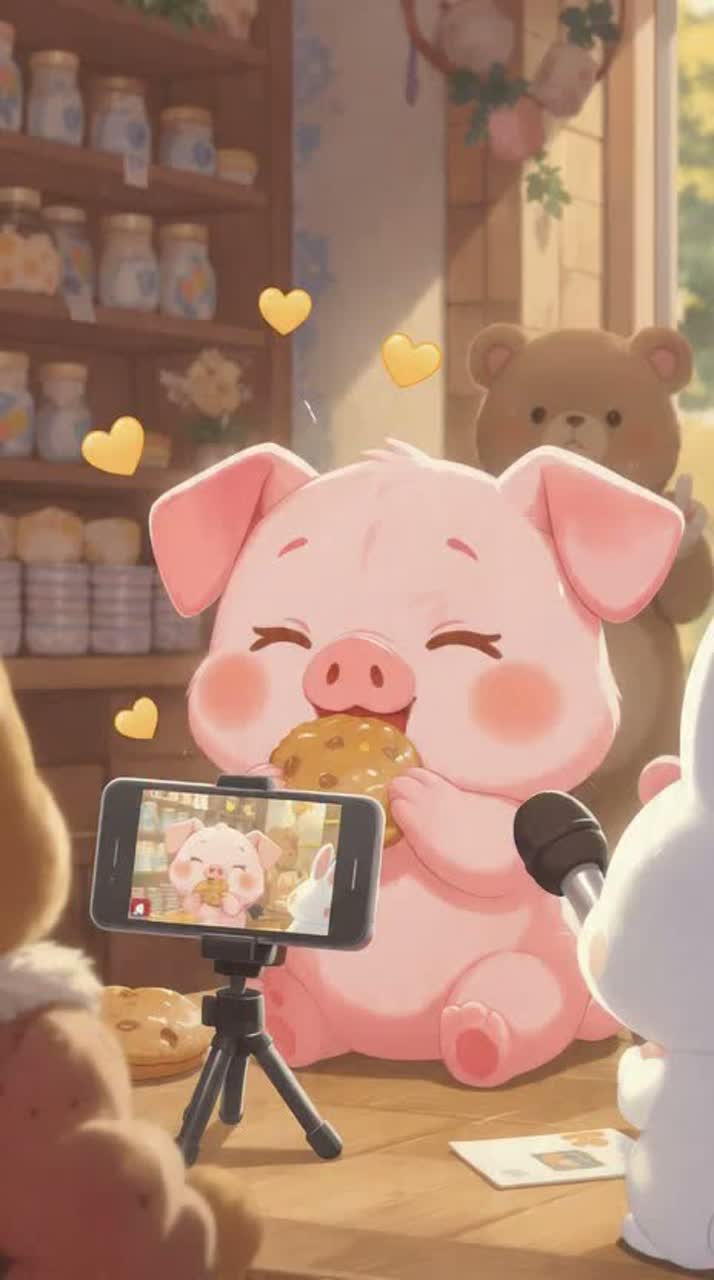 A cute girl narrates a story about a Piglet doing a "mukbang" ASMR stream with cookies, Focus on crisp consonant sounds and soft giggles, No instruments