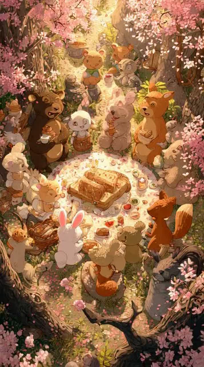 Female young girl voice, cute and bright but whispering, ASMR, spoken word, no music, close to mic, airy vocals, spring atmosphere, gentle breathy sounds, high quality recording, 68bpm, Description: The grand finale of the bakery story, A spring festival with forest animals, Focus on soft, happy whispering and the texture of eating sounds, No background instruments