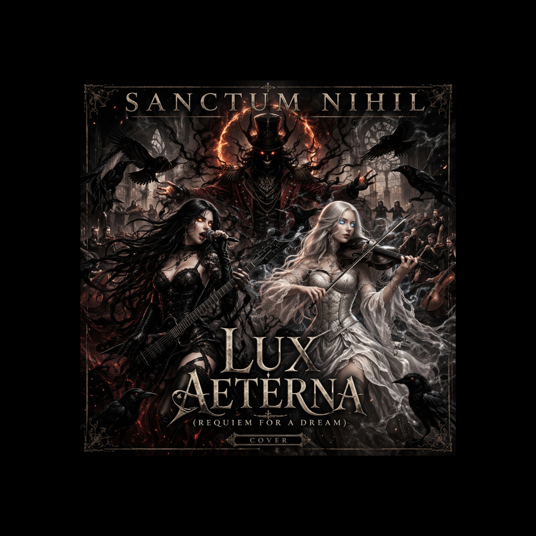 lush symphonic-metal instrumental, inspired by Lux Aeterna structure, grand piano and organ lead, full orchestra with strings, brass, woodwinds, timpani, and dramatic percussion, bass, harp, strings, trumpets, trombones, and tubas, piano, acoustic guitar, electret guitar, oboe, flute, wind flute, Clarinet, Xylophone, French Horn, Bassoon, thunderous taiko and live drums, double-kick blast beats, distorted electric guitars with layered harmonics, deep sub-bass rumble, layered adult and children choirs for epic harmonies, pipe organ swells, cinematic dynamic range, tension building motifs with repeating ostinatos, slow-building suspense to explosive crescendos, heroic and tragic interplay, beauty within destruction, relentless rhythm with syncopated percussion, soaring melodies layered over apocalyptic stereo imaging, perfectly balanced chaos and melody, epic cinematic storytelling, awe-inspiring emotional climax, ends in reverberant fading resonance, symphonic gothic metal