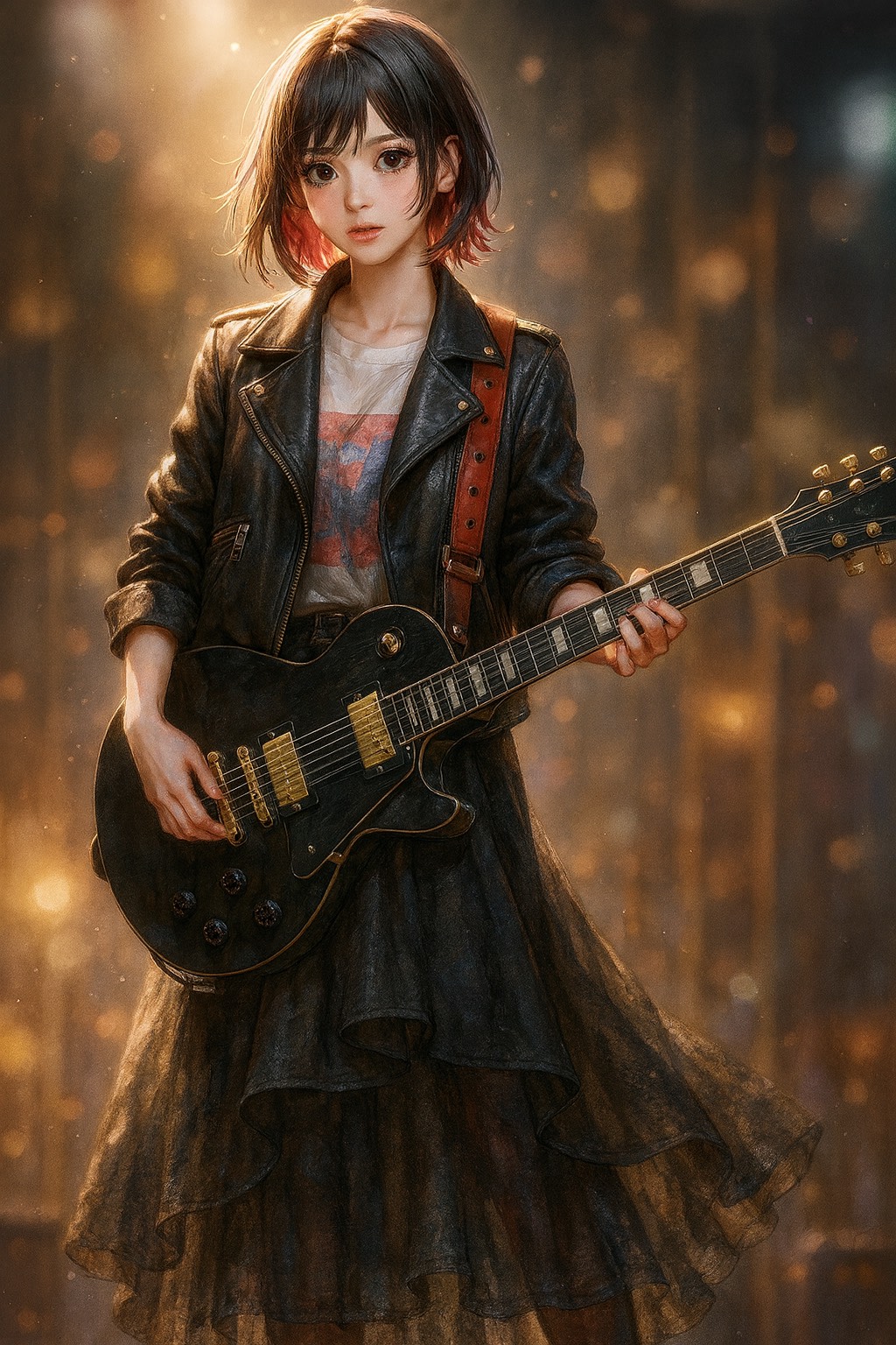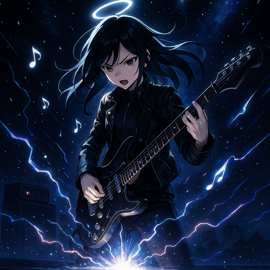 Gothic Rock × Electro Rock × Industrial Symphony, Tempo 102 BPM, Key Em, Mood: Sacred, Dystopian, Tragic, Powerful, Theme: A female guitarist awakens in silence and creates the world with sound, Intro: Metallic choir, thunder FX, glitch echo, low synth rumble, Verse: Distorted bass, low synth arp, gated drums, female vocal fragile yet strong, deep reverb, Pre-chorus: Glitch build, reverse pad, tension rise, Chorus: Full guitar wall, digital choir, heavy reverb tail, emotional explosion, Bridge: Whisper voice + glitch overload + industrial hits, Solo: Distorted guitar lead, feedback, metallic delay, Final chorus: Massive layered guitars + choir + thunder impact, Outro: Church bell fading into static, sub-bass drone, Contrast: Divine vs Corrupted, Metallic vs Organic, Mix: Dark, cinematic, epic space, Vocal style: gothic emotion, dynamic growl and breathy tone, Mastering: wide stereo, 6s reverb, analog warmth, glitch texture