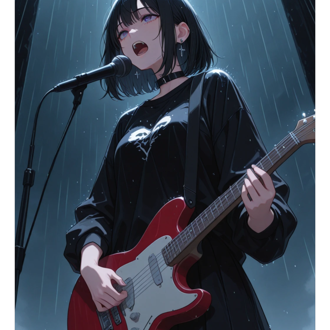 then erupt in the chorus with a shout-like delivery that feels like lightning striking the sky, Slight rasp, expressive vibrato, and natural aggression in tone, Distorted rhythm guitars up front — thick, saturated, and alive, Add octave leads or harmonic feedback in the background for a sense of “rising energy, ”