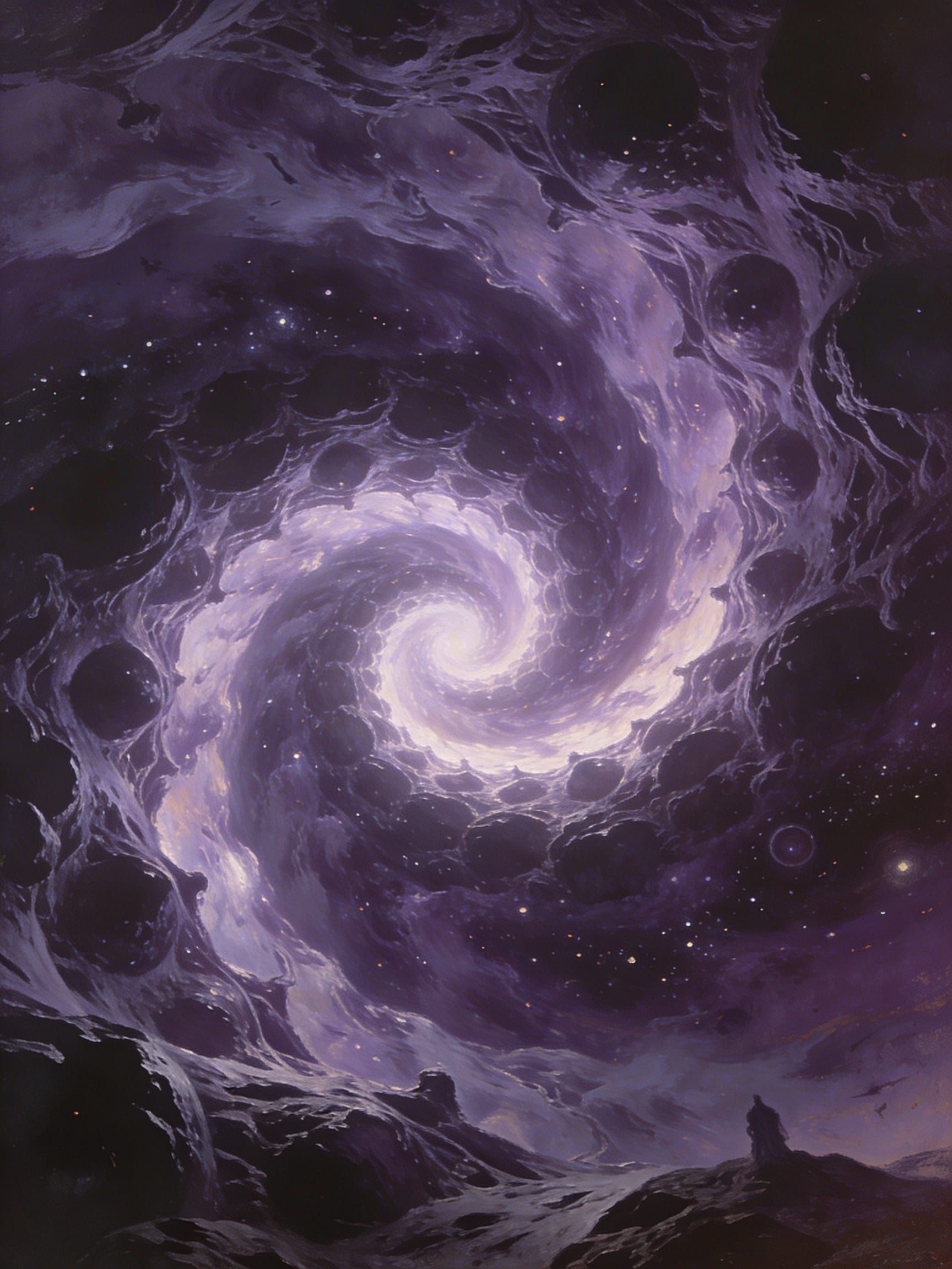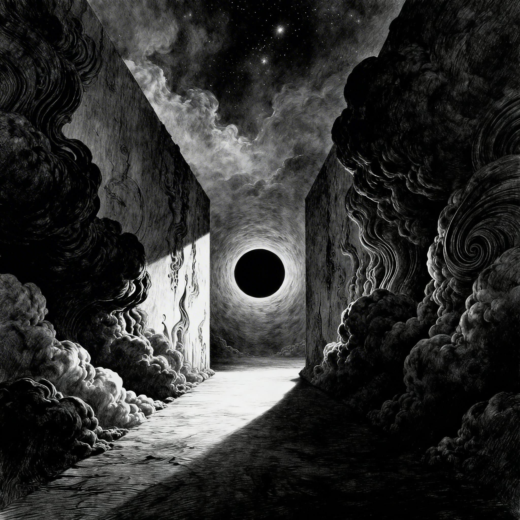 Sub-bass rumbles and processed white noise gradually engulf everything, creating an all-consuming, oppressive sonic void, Layers combine into dreadful emptiness, leaving only faint, unsettling frequencies and a sense of infinite space, Wall of sound, harsh, abrasive, depressing, post-metal, world ending, coiling