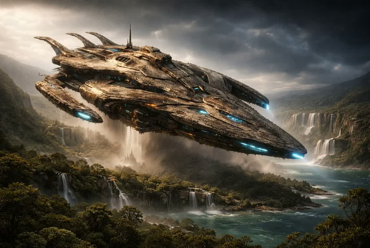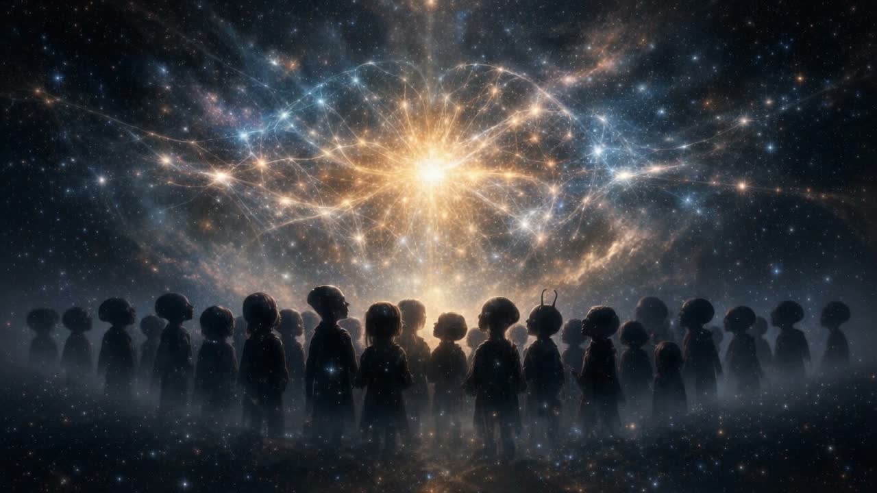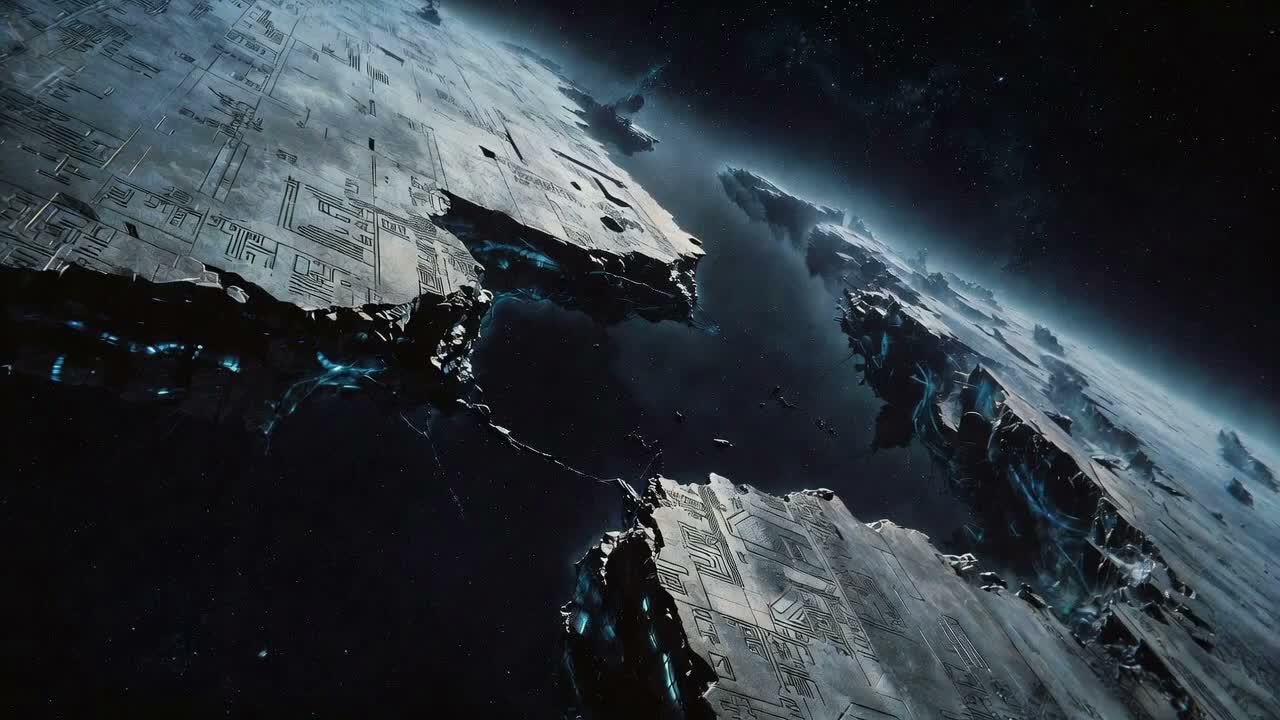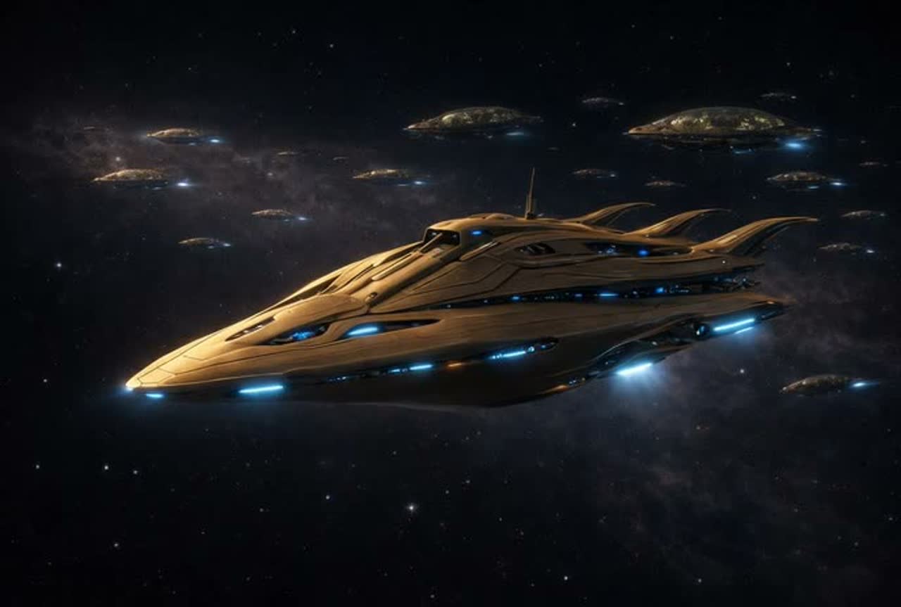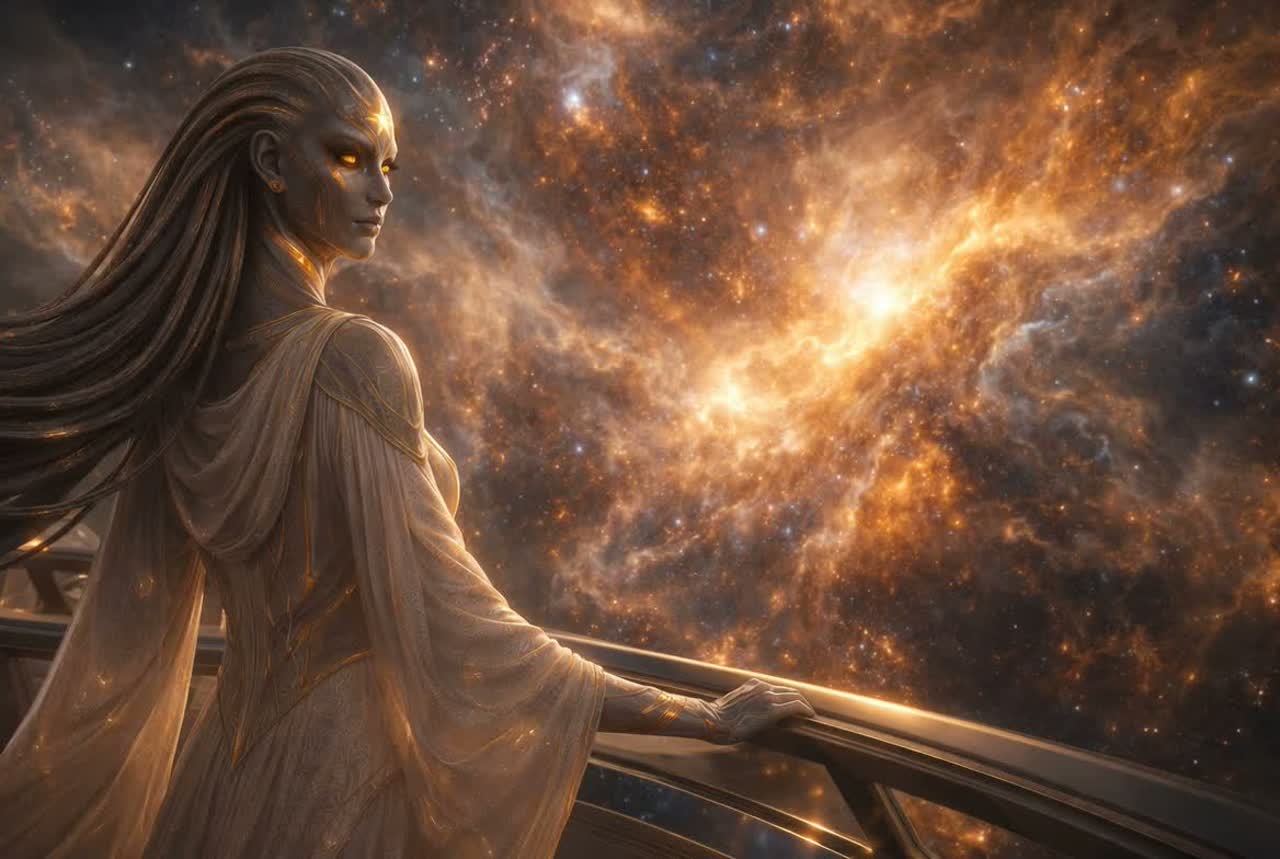 A slow, mysterious, and contemplative vocal soundtrack featuring an ethereal non-human voice, luminous and calm, Timeless artificial intelligence with a serene, observing presence, Clear higher register, floating tone, minimal vibrato, Warm but restrained, distant yet benevolent, The arrangement blends modern cinematic and sci-fi elements: ambient synth pads, distant cosmic textures, subtle electronic pulses, deep orchestral strings, and gentle harmonic layers, The music conveys farewell and continuity rather than overt emotion, carrying a sense of loss transformed into purpose, The voice feels ancient and timeless, as if emerging from memory and light rather than a human body, The composition evolves gently with spacious phrasing and a sacred, enduring atmosphere, evoking the solemn departure of an interstellar exodus fleet