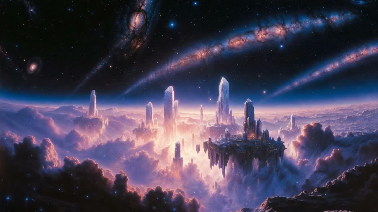 space progressive rock odyssey with a female dreamy voice, ethereal female choir, ethereal floating synth landscapes, intricate acoustic-electric guitar interplay, propulsive driving bass grooves, complex polyrhythmic drums with tribal toms, swirling Mellotron choirs and string machines, starry arpeggios, gradual builds from serene ambient to powerful climactic rock explosions, modal scales with bright major arrivals, cosmic exploratory feel, psychedelic yet structured, instrumental only, lush reverb-drenched production, 60-90 bpm, vast interstellar atmosphere, spiritual awakening vibe
