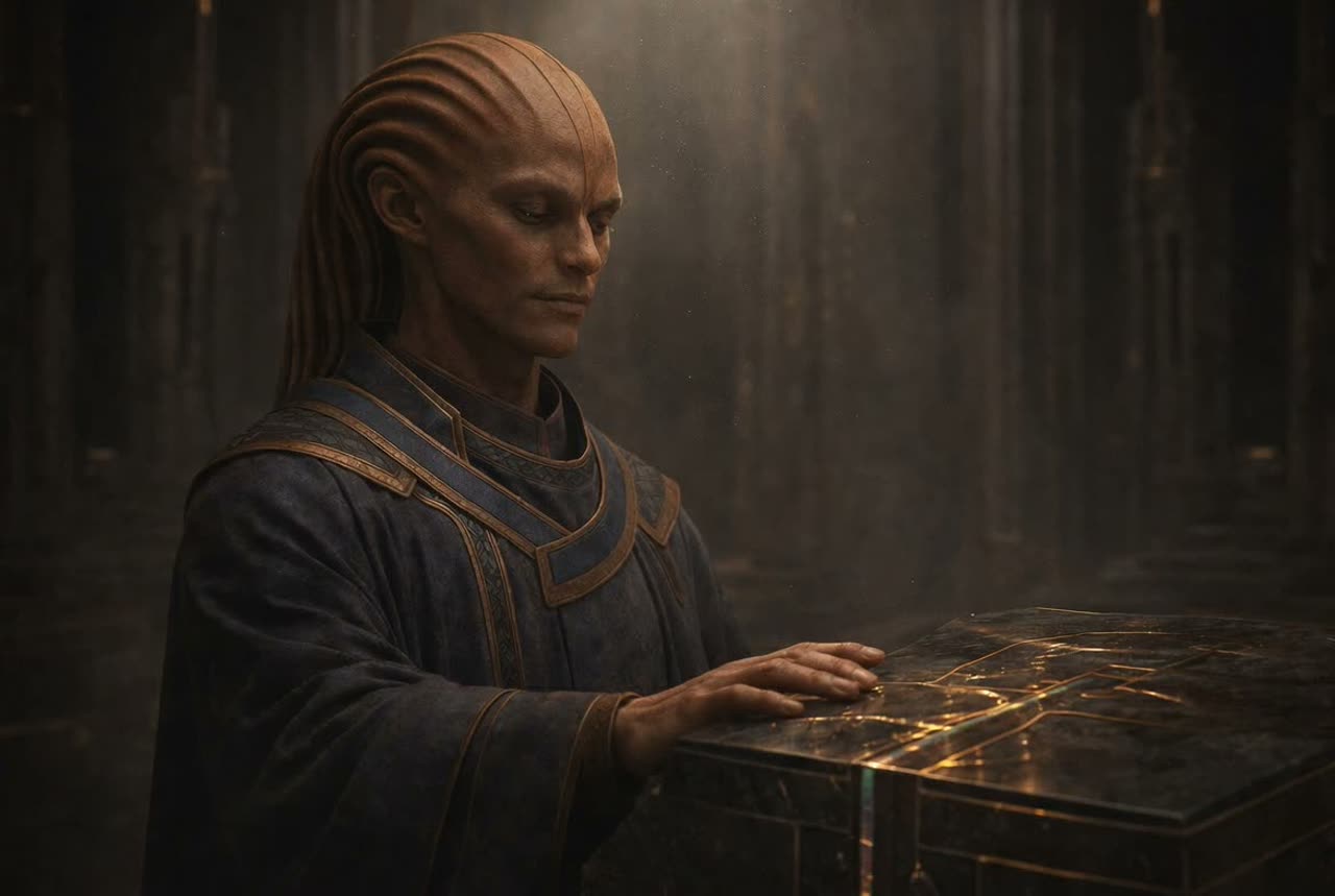 The piece is a spoken word narrative, A slow, solemn alien meditative chant, Deep male voice sings in a fictional, ancient-sounding language – no real words, only resonant syllables and tonal fragments, The vocal line is slow, breathy, and emotionally raw, Backing includes distant harmonic drones, soft ambient pads, and occasional glassy alien textures, No rhythm or beat, Each phrase flows into the next like breath in silence, Tuning is non-human: slight dissonances, unusual intervals, unresolved tonal shifts, The mood is introspective, sacred, and deeply personal – like a voice calling out into eternity from within an alien temple, No other voices, no harmonies, Just one being finding his tone