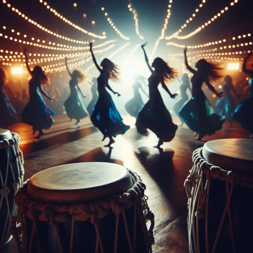 percussion drums, tribal, shamanic, Tribal dance, African drums, djembe, energetic rhythm, crowd chant, echo effect on "Dunia", rising tempo, percussions, deep bass, hypnotic night atmosphere