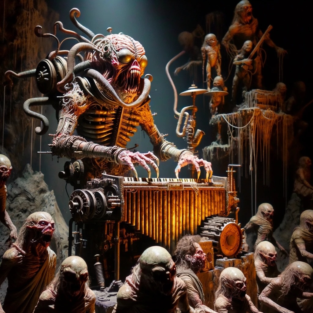 horror melodies and italodisco hardstyle edm psychotic dubstep techno with, skull and bone -drums, organic torturing organic instument leads, drops and catchy melodies, toally sick twisted drops and violin and piano solo