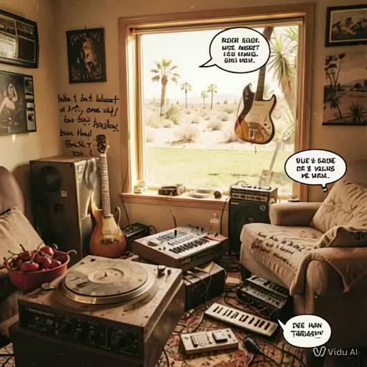 weirdcore, turntablism, anti-folk, slacker rock, chopped breakbeats, scratch fills, detuned electric guitar, deadpan spoken vocals, toy keyboard stabs, lo-fi drum machine, found sound collage, radio static cuts, spring reverb, tape saturation, mono room mic, 88 BPM, swung backbeat, bittersweet satire; epic weirdcore turntablism