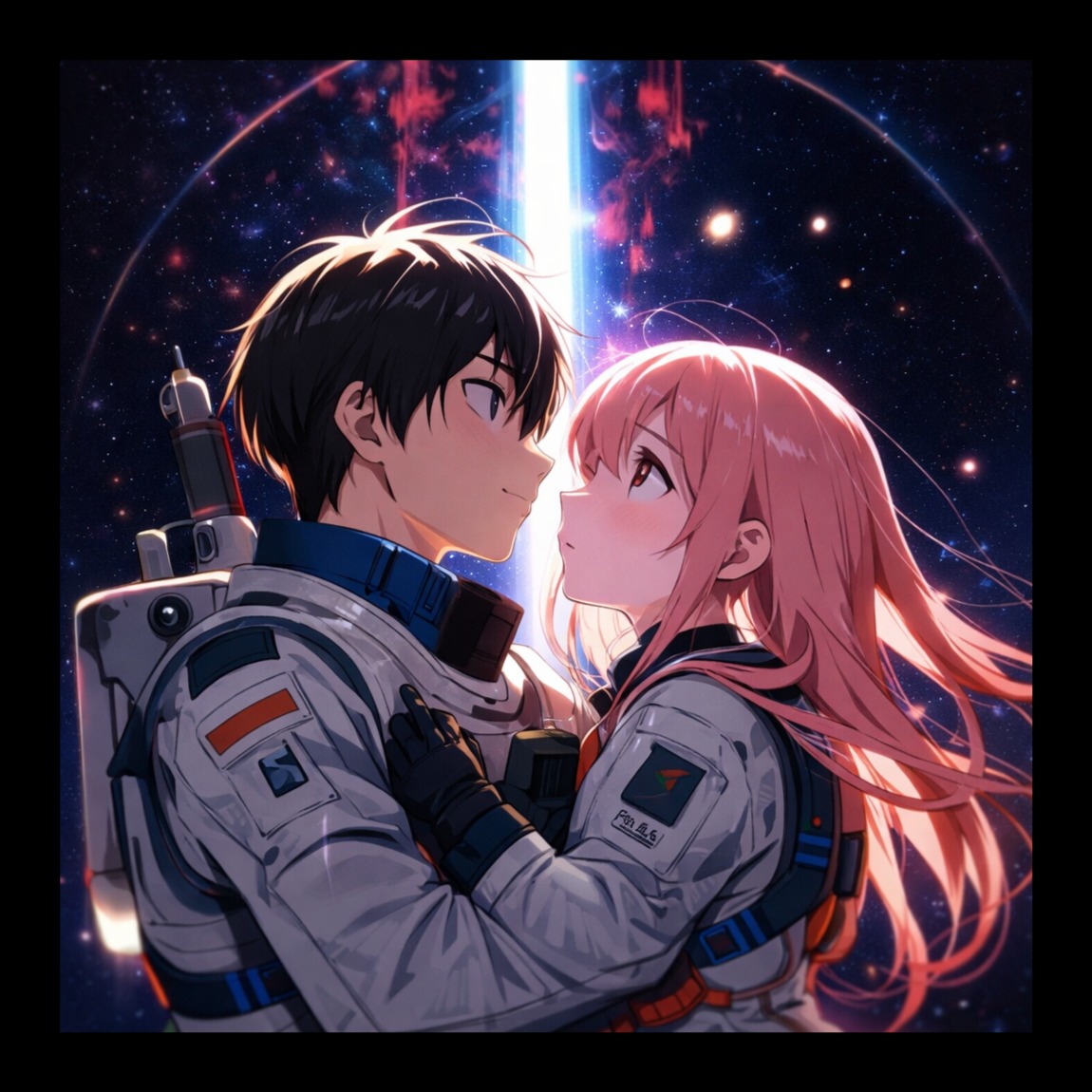 Sugar-rushed hyperpop with crushed synth arps, detuned bells, and stuttering vocal chops; kick slams under distorted 808 subs, Verses feel floaty and dreamcore, autotuned male vocals skating over reverb-soaked pads; choruses explode with stacked harmonies, bitcrushed risers, and glitchy reverses, FX sweeps and filtered delays keep everything swirling like zero-gravity candy, anime, hyperpop