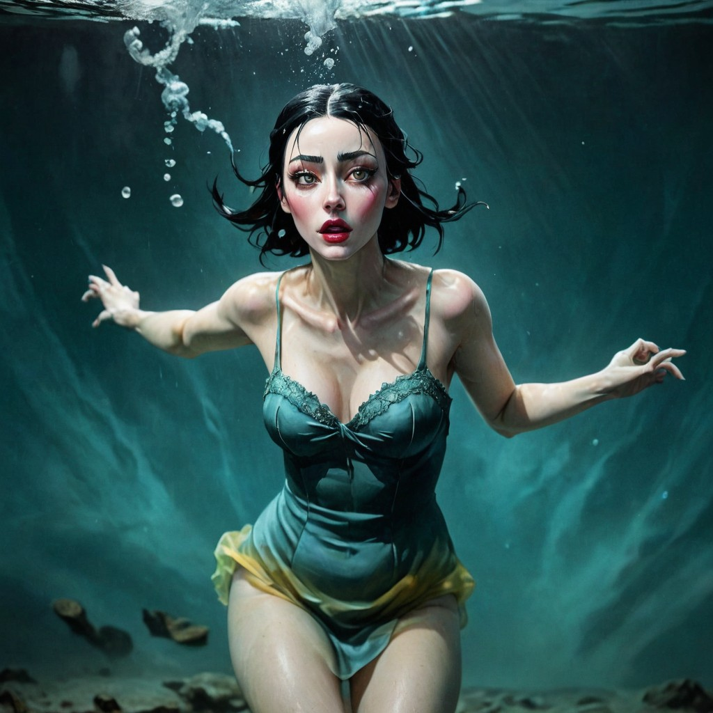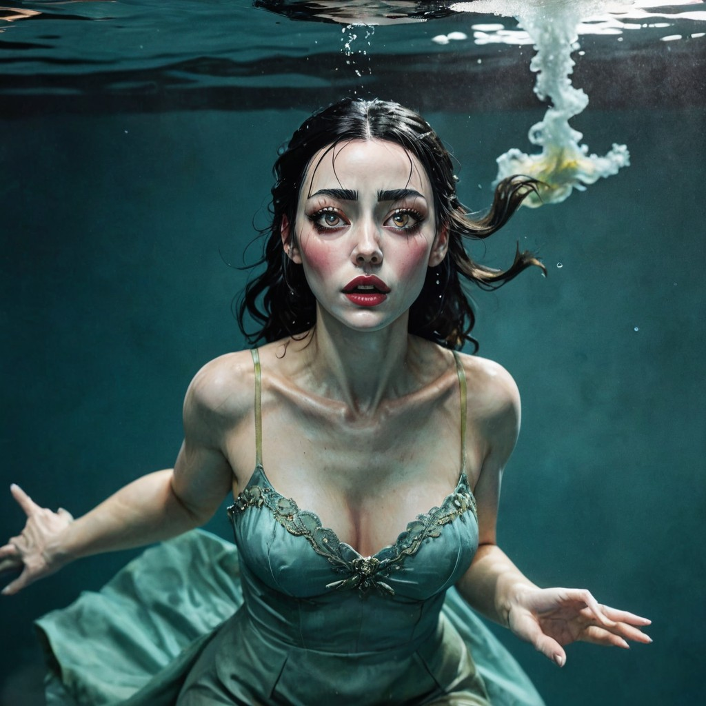 A track in the style of Gothic Folk-Noir and Ritualistic Dark Ballad, Mood: submerged, mournful, hypnotic, suspended between dream and waking, An upright piano plays a cyclical, blurred melodic phrase, central in the mix, joined by acoustic guitar arpeggios that ripple like water, Deep bass moves slowly beneath, anchoring the piece in gravity, Steady tom-driven percussion beats like a heartbeat, weighty but restrained, Sparse organ and string swells rise like distant underwater currents, Subtle sound textures (drips, echoes, reverberations) weave into the atmosphere, Vocals: a fragile, ethereal female lead, melodic yet half-breathing, carrying both sung and spoken passages, Occasional male echoes appear in the choruses and bridge, shadowy and minimal, never dominating, Together the voices create a ritual-like cycle, closing with the stark confession: “I’m drowning, ”