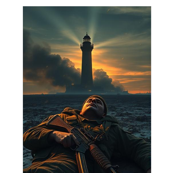 A Britpop-meets-Celtic rock ballad about a soldier haunted and comforted by the image of a distant lighthouse during war, Opens with soft ambient rain and sparse acoustic guitar, joined by haunting bagpipes that swell in slowly, Verses are conversational and intimate, told in a gritty male vocal, contrasted by bagpipes and muted drums, Choruses are melodic, bittersweet, and anthemic — driven by rhythmic electric guitar, surging strings, and layered bagpipe leads, Bagpipe solo midway weeps through the chaos like a prayer, Ends with a double chorus and an extended instrumental outro — a soaring release of layered guitars, bagpipes, and ambient feedback, as if reaching the lighthouse in death, Feels like rain hitting tin, flickers of home through the storm, and finally—light