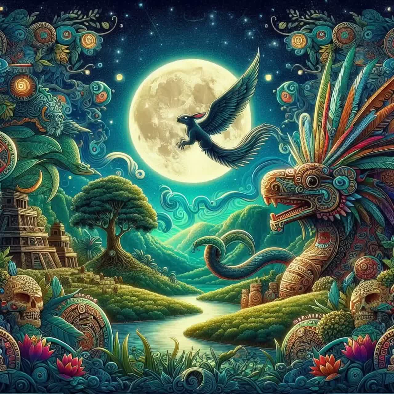 A mystical soundscape unfolds with teponaztli and huéhuetl driving intricate, interlocking polyrhythms, Haunting native flute soars above, punctuated by resonant conch shell calls, Ambient drones create depth, while ethereal chants and delicate bells layer in, swirling with ritualistic nocturnal energy, ‑Rock, ‑pop, ‑Violin, ‑guitarr, ‑hiphop, ‑urban, ‑electronic