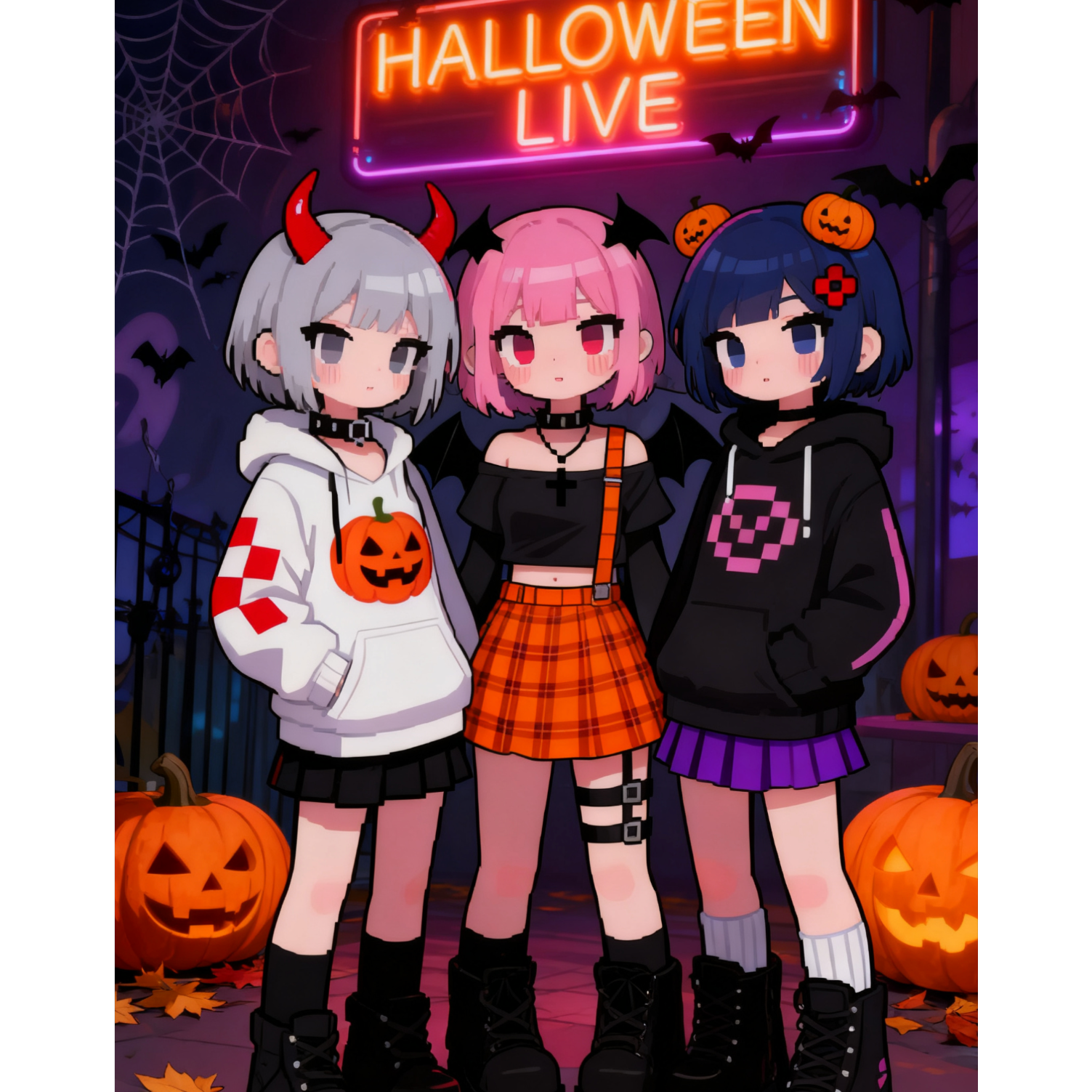 [Kawaii × Playful × Electro-Punk Idol × Shibuya Urban Pop × Garage Rock × 8-bit Halloween Fantasycore × Mid-Tempo Symphonic × UK Garage × Future Hip-Hop × Reverb Tunnel Ambience × Grainy Texture × SideChain Compression × Emo], [Three differentiated female vocals: Yoruha (air-falsetto emotional trembling lead, high register), Kaoru (scratchy punk with rhythmic drive, mid-low register), Mizuki (dry monotone talk with syncopated rap phrasing, mid register)], [432Hz tuning, Hi-Res mastering]