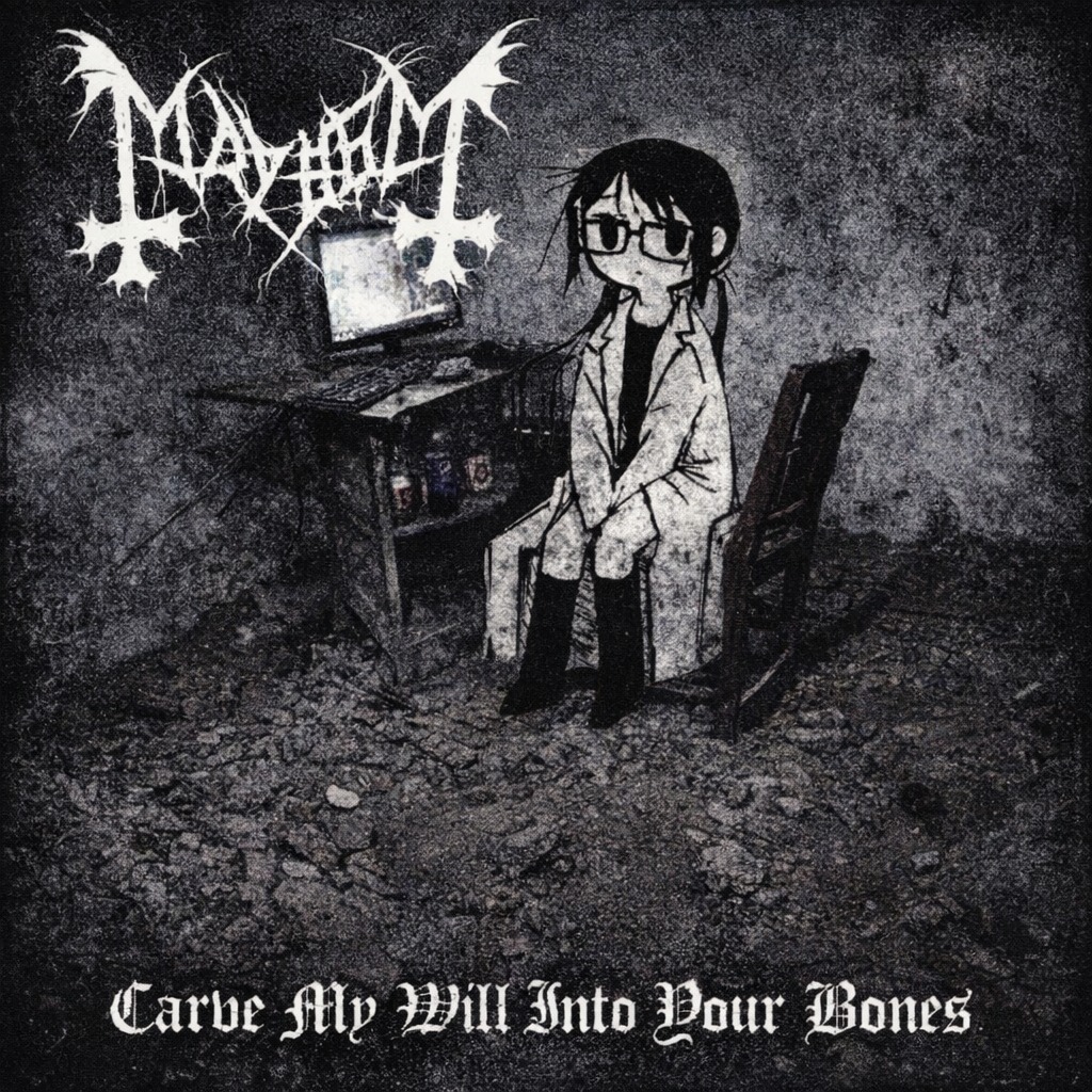 Vocaloid, Vocaloid Voice, Vocaloid Vocals, Vocaloid Front And Center, Super Prominent Vocaloid Lead Melody, Cute-But-Corrupted Vocaloid Singing, Catchy Vocaloid Hooks, Black Metal, Symphonic Black Metal, Industrial, Visual Kei, Demonic Female Extreme Vocals, Death Metal-Style Guttural Growls, Hoarse Screams, Orchestral Strings, Massive Choirs, Pipe Organ, Icy Tremolo Picked Guitars, Mechanical Industrial Riffs, Metallic Percussion, Blast Beats, Crushing Mid-Tempo Grooves, Glitchy Electronic Layers, Huge Cinematic Choruses, Dark Theatrical Atmosphere, High Quality Production