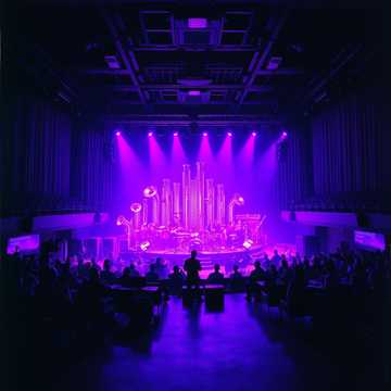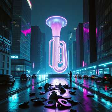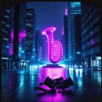 120bpm, loud drums, tuba, very deep sound, instrumental, cyberpunk, jazz, dark, post-industrial, noctur, bass boosted, destroyed speakers, depressive, reverb, concert hall, tuba orchestra, субгармонизированный