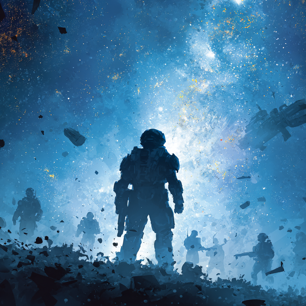 Post-black metal with eerie dark ambient and dreamcore textures, Ultra-modern futuristic production, synth bass and polyrhythmic drums in odd time signatures (7/6, 11/8, 13/12, 17/16), A soldier’s journey across space to fight an alien war: time dilation strips away family, friends, and humanity; vicious combat erodes his soul, Vocals alternate between harsh growls (verses) and ethereal cleans (pre-chorus/chorus), with a chaotic fractured bridge and ambient outro, Emotional arc: departure and loss → war and dehumanization → recognition of shared humanity at the enemy’s world, Atmosphere: collapsing universe, cosmic drones, choir pads, dissonant guitars, ambient fade, Vocals are weary and cracked, alternating between clean delivery and whisper-layered harmonies, enhancing tension and emotional depth as each section expands and contracts in intensity, The growls are rumbling, deep, and crushing