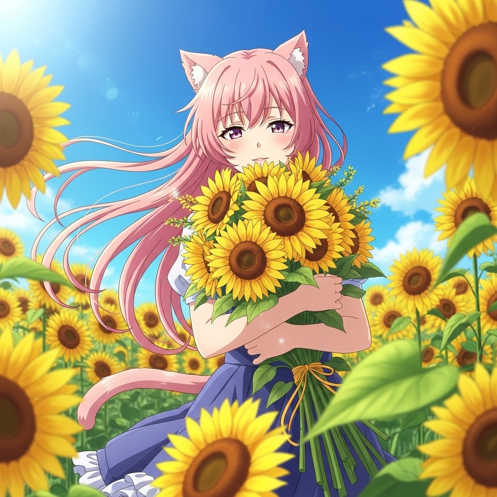 A chaotic fusion of Jungle breakbeats and 8-string Djent metal, with Japanese psychedelic rock and surreal cat and sunflower imagery, Fast BPM (170+), glitch drums, heavy guitars, distorted bass, noise textures, Androgynous male vocals shift between whispering, screaming, falsetto, and glitchy edits, Japanese lyrics with some English, about madness, emotional collapse, and hallucinations, Themes include a watching cat and sunflowers wilting under a burning sky, Ends with a distorted breakdown, fading into a faint meow and wind through sunflower fields, Genre: Jungle × Djent × J-Rock × Experimental × Catcore