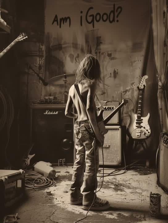Raw garage grunge with psych-rock influences, Lo-fi distorted electric guitars, gritty bass, minimalistic yet punchy drums, Vocals are emotional, slightly raspy, fluctuating between subdued singing and intense screams, Dynamic builds in choruses with layered harmonies, Ambient noise and subtle reverb create an introspective, haunting atmosphere, Tempo moderate, rhythmic but free-flowing, Emotional tone: introspective, questioning, slightly anxious, tension-filled, Mix emphasizes mid-range guitars and raw vocal presence with organic, imperfect textures