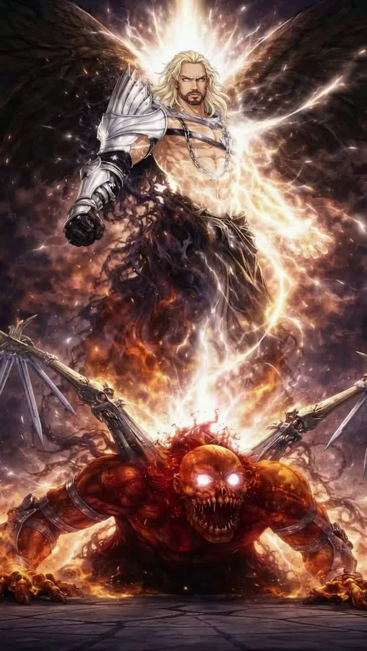 Epic dark fantasy battle song with strong tempo shifts, alternating fast aerial combat and slow crushing impact sections, orchestra and choir, intense percussion, heroic and heavy, god boss fight, fast sections for flying combat, slow sections for massive shockwave and divine arrival, dramatic dynamic changes, cinematic, high energy, powerful and mythic