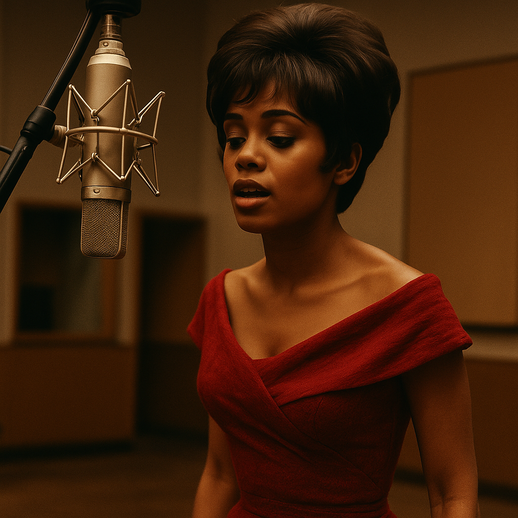 A lush, romantic melodic song in a 1960s pop-soul style, with elegant orchestration featuring piano, strings, light brass, and gentle percussion, The vocal should be a female lead, smooth and expressive, with a warm midrange tone, soulful yet graceful, carrying subtle vibrato and emotional nuance, Backing vocals should be soft, blended harmonies that lift the choruses, Instrumentation should feature orchestral strings, gentle brushed drums, piano arpeggios, light brass flourishes, and bass with a walking yet restrained feel, The arrangement should be concise, graceful, and radio-friendly, focusing on intimacy, longing, and timeless romance, The final chorus should repeat softly and gradually fade out, with layered vocals and strings lingering into the close, like a classic 60s radio ballad