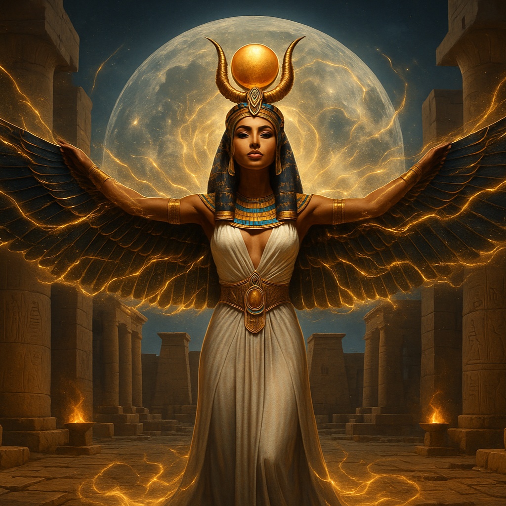 A slow to mid-tempo trip hop groove supports ancient Egyptian sistrum, frame drums, oud, and ney over deep sub-bass, lush ambient synths, and cinematic textures, Hijaz and Phrygian scales shape powerful female melismas, whispered harmonies, 3D audio, bold vocals, pulsing drops, and mystical ritual layers, electro dance, beat drops, nocturnal, desert, traditional egyptian