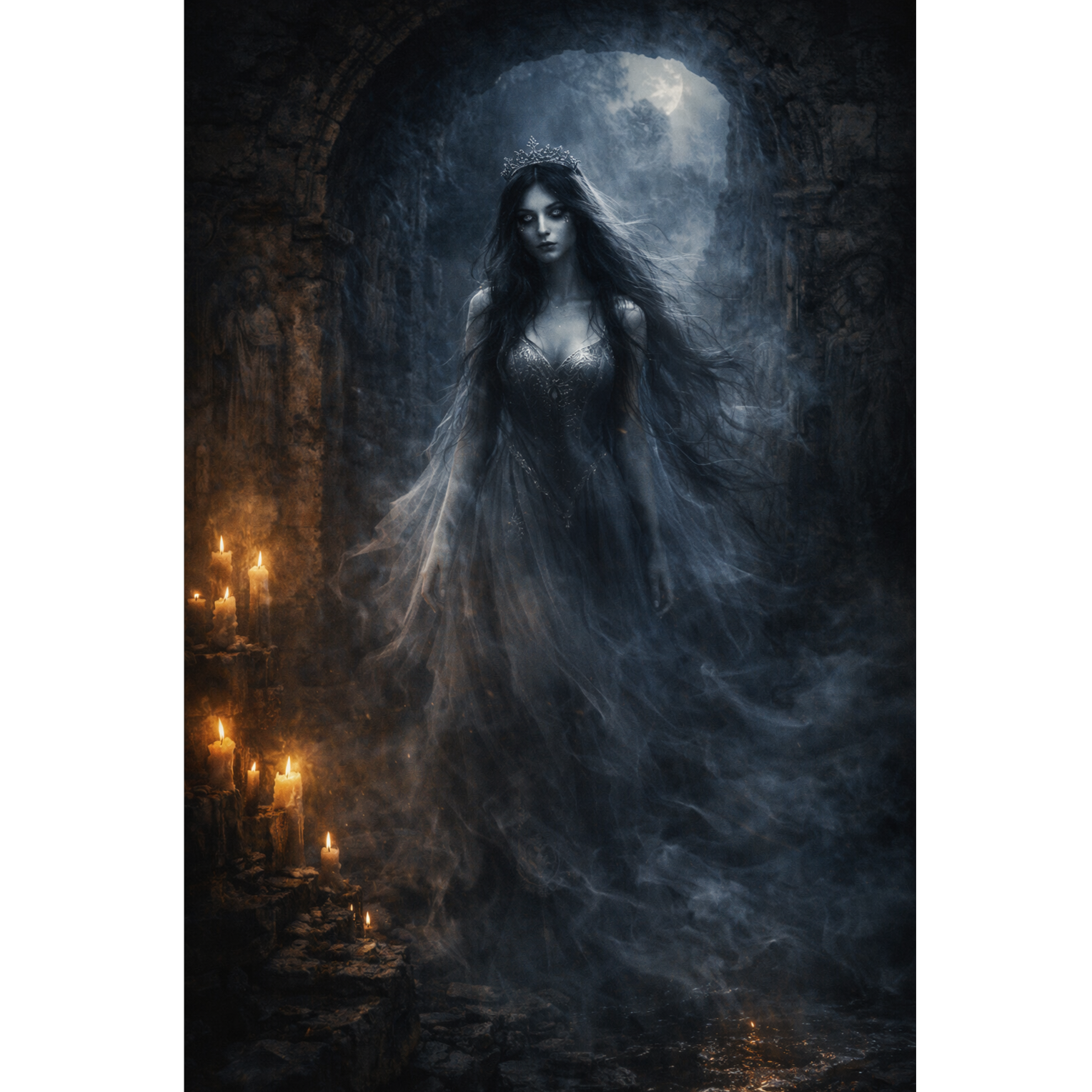 Create a dark gothic requiem blending classical and doom metal, Tempo ~45 BPM, time signature 6/4, Use a deep, velvety female contralto vocal, haunting and resonant, sung with a strong Romanian accent throughout, Delivery must be sung, never spoken, with long sustained phrasing and reverb, Lyrics are mainly in English with Romanian choruses, evoking a ghostly lament echoing through stone and mountain, Evoke an ancient ritual in a vast, ruined monastery, Use cello, viola da gamba, double bass, hurdy-gurdy, and subtle pipe organ with deep drones, bowed harmonics, and echoing textures, Add doom-metal undertones with distorted bass and slow, ceremonial percussion, Keep the tone ancient, mournful, and sacred, filled with heavy resonance and cathedral reverb