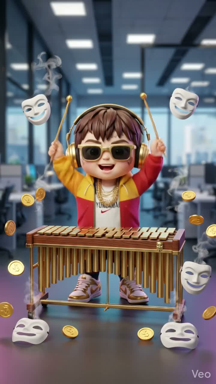Prompt: A high-speed, comical rock track reminiscent of Eurodance with a prominent, playful vibraphone melody, The song features heavy slap bass and distorted guitar for a powerful yet funny atmosphere, The vocals are over-the-top and theatrical, delivering a story of an office worker's secret rebellion, The mix is punchy and wide, emphasizing the frantic energy of the vibraphone and the driving beat