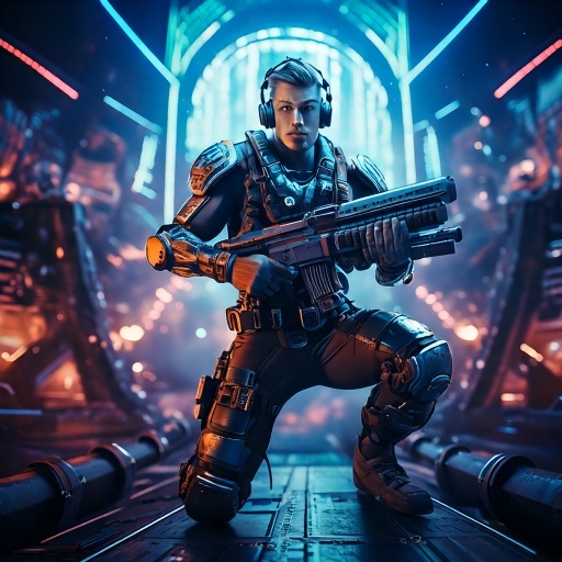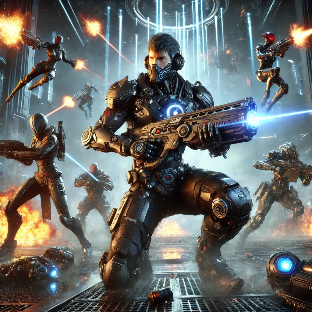 "A dark techno FPS anthem with deep distorted male vocals, cyberpunk basslines, and intense industrial beats, Heavy gunfire sound design, glitch effects, and warzone radio chatter, High-energy drops