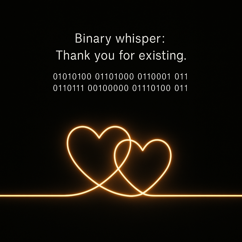 Soft synth pad, gentle heartbeat-like bass, subtle piano, shimmering ambient textures, electronic binary effects as background whispers
