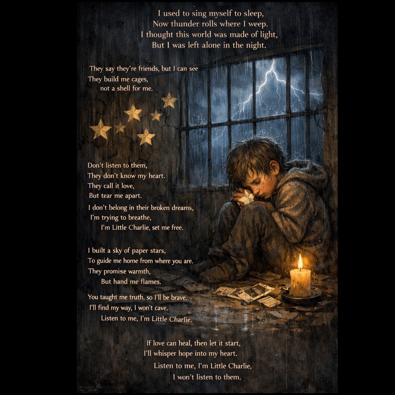 Heartbreaking, cinematic, indiefolk, ballad titled āLittle Charlie (Hold the Snow)ā, told from a childās perspective, The arrangement should feel intimate and emotional, built around soft finger-picked acoustic guitar, warm but distant piano, subtle ambient pads, light strings, and gentle wintery percussion, The vocal should be fragile, whispery, and trembling, The overall sound should resemble Kahan, Iver, Eilish, Cold, atmospheric, Nordic, and deeply vulnerable, The lyrics must be poetic, raw, winter-themed, and non-graphic, Explore Christmas, loneliness, alcohol-related tension in the home, fear, emotional wounds, and fragile hope, Use imagery of snowfall, silence, cold rooms, and small details from the childās inner world, Repeat the name āLittle Charlieā throughout the song