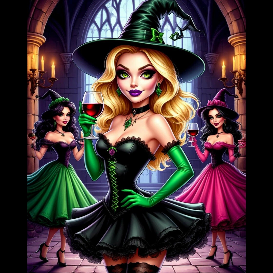 Dark whimsical Halloween party song with a playful Tim Burton vibe, Tempo: around 105 BPM, 4/4 meter but with a bouncy dark-waltz swing (keep the subtle 1-2-3 feel inside 4/4), Instrumentation: spooky upright piano, pizzicato strings, music-box glockenspiel, double bass, light jazzy drums, Intro: delicate music-box melody, like a magical carousel starting to spin, Female lead vocal for all verses and choruses – bright, theatrical, witchy, a little mischievous, Pre-Chorus (“Ночь Хеллоуин…”) – add small mixed choir with playful Halloween “whoo-hoo” and “ha-ha” shouts for atmosphere, Overall mood: fun, tipsy, magical and slightly cheeky, like a drunken fairytale rather than scary, Keep Russian pronunciation clear and rhythmic; no male lead lines
