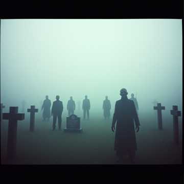 A retro horror-inspired track driven entirely by zombie voices: dense acapella harmonies in close, dissonant intervals, basses rumbling with a droning low end, eerie leads floating above, Percussive mouth sounds and twisted vocal effects build a nervous groove, with dramatic swells heightening suspense