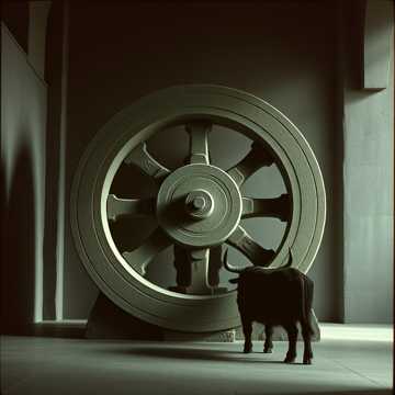 Slow, heavy theatrical progressive rock with ritualistic atmosphere, Deep, grounded repeating bass notes forming the foundation, Sparse but powerful drum hits with wide space between beats, emphasizing weight over speed, Low, sustained electric guitar chords with subtle overdrive, no fast riffing, Gradual dynamic build throughout the song without increasing tempo, Verses delivered in controlled half-sung style with calm authority, Pre-chorus slightly more melodic but restrained, Chorus broad and chant-like with layered low backing vocals creating a subtle choral effect, No flashy solos; tension builds through repetition and harmonic layering, Production dark, spacious, organic, with emphasis on depth and low frequencies, Mood: endurance, contained power, patience under pressure, massive presence beneath stillness