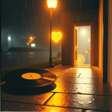 The atmosphere should feel like a quiet midnight lounge hidden inside a rainy train station, with warm golden reflections and deep emotional sweetness, Instrumentation: